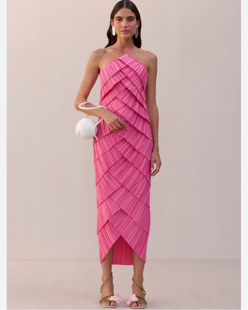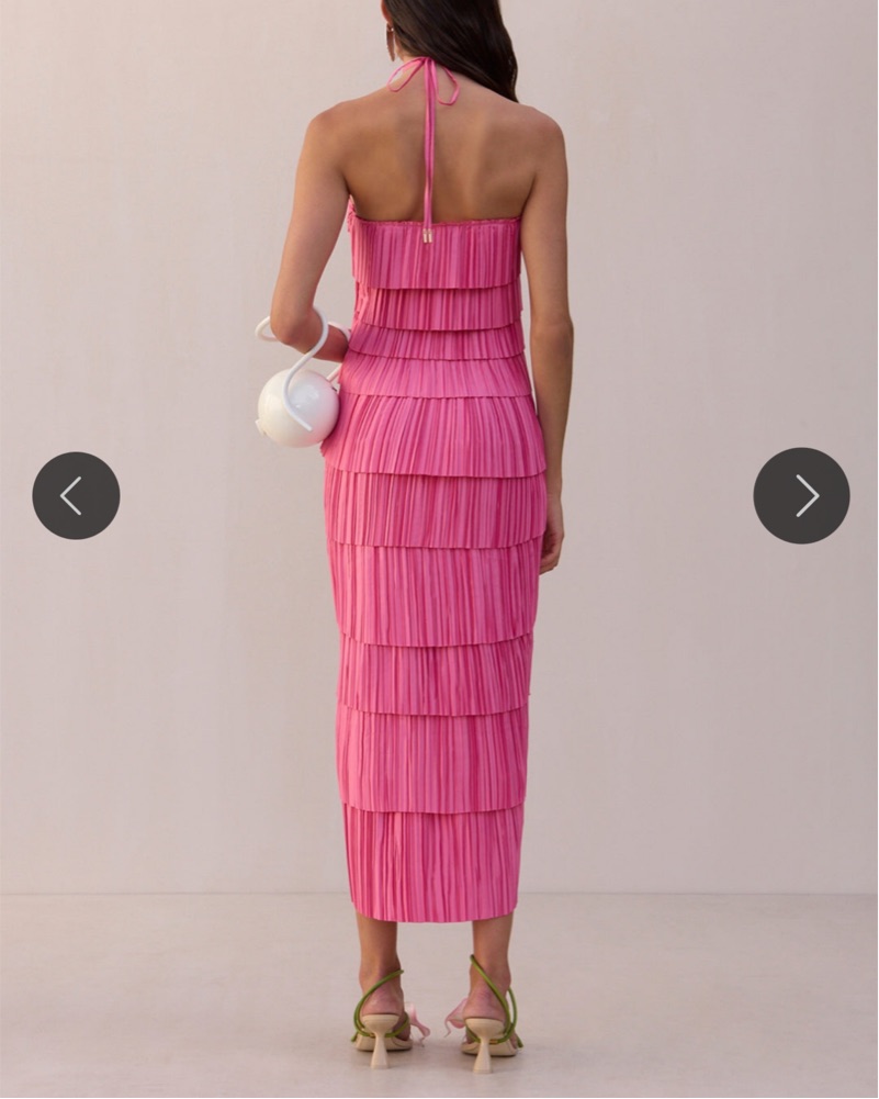 • Halter neck • Tie closure at back of neck • Sleeveless • Pleated, tiered detail throughout • Tulip hem