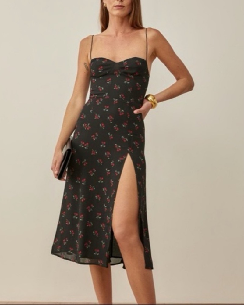 super cute! has a slit in the thigh, scrunch back and thin straps. perfect for a holiday party or dinner!