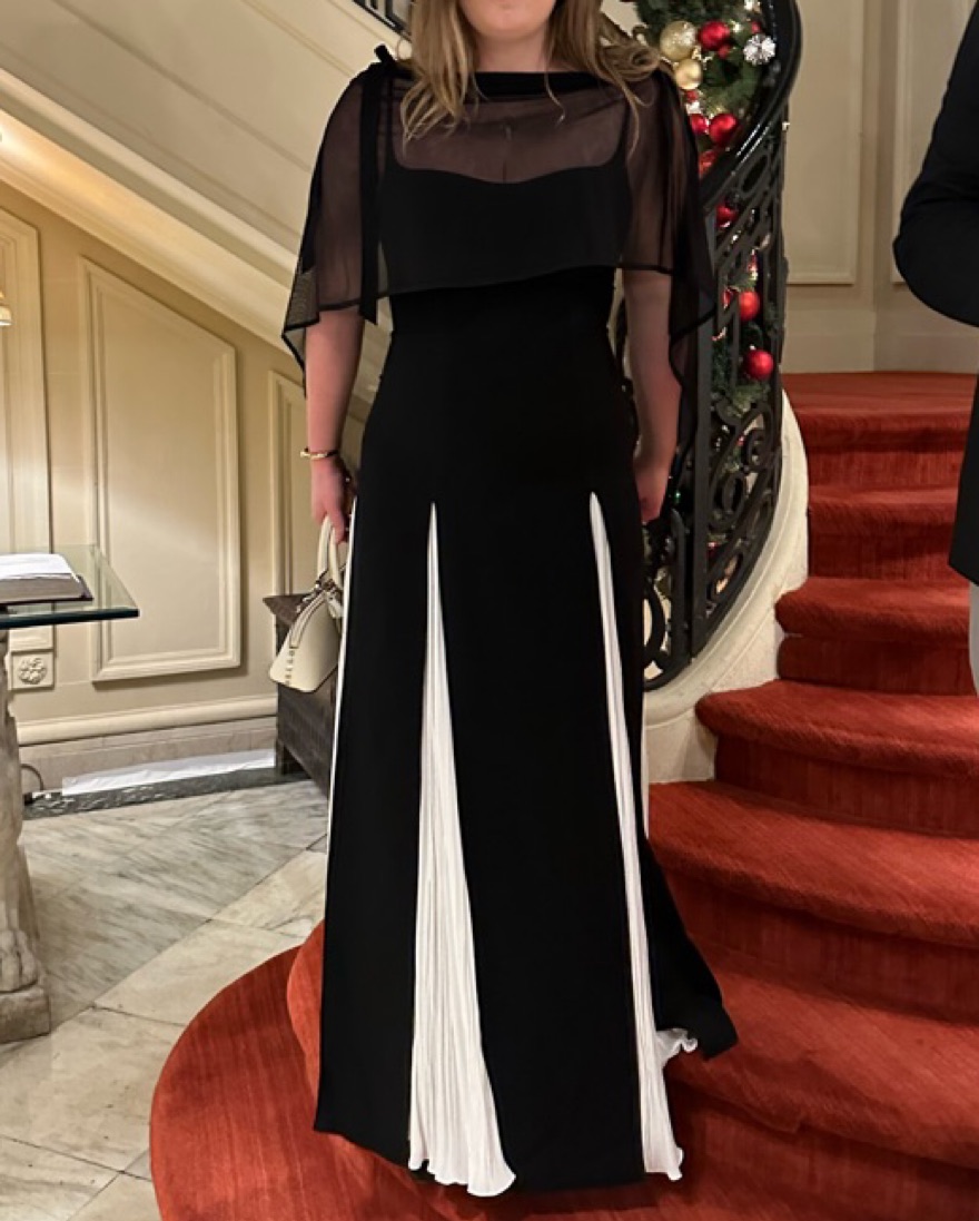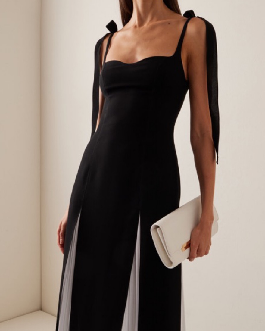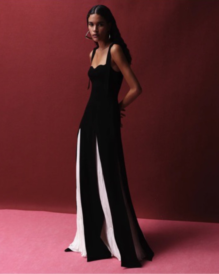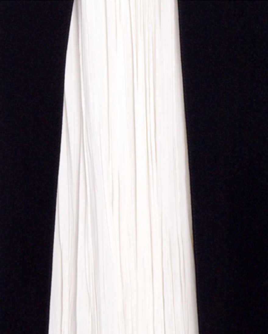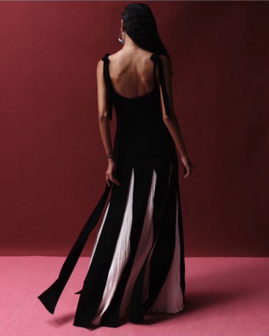 Silk crepe overlay with plissé chiffon under layer. Fixed tie straps. Size EU 42 translates to a US 12 but this dress fits small and is best suited for a US 8. Shown styled with a chiffon shawl in first two photos, can be included in rental by request.