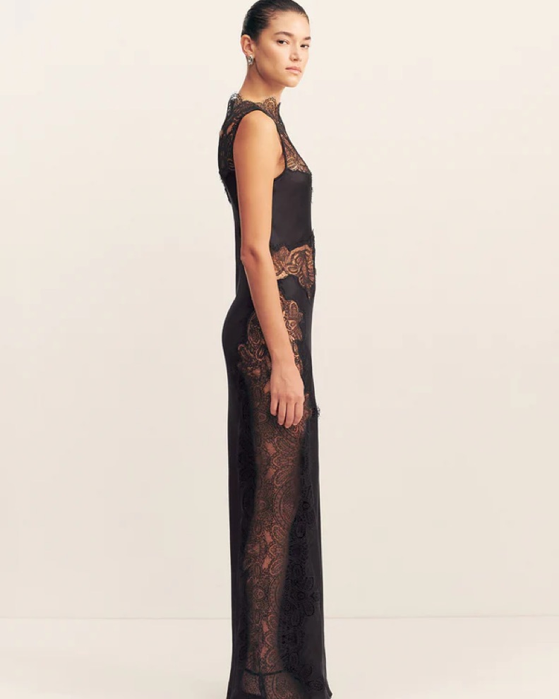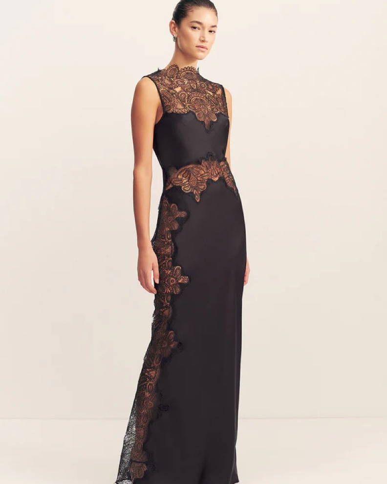 Worn once Matte finish satin High neckline Cut out sheer lace details Buttons at centre back Maxi length skirt Lightweight, non-stretchy woven 62% Viscose 38% LENZING ™ ECOVERO ™ Viscose 100% Nylon Lace