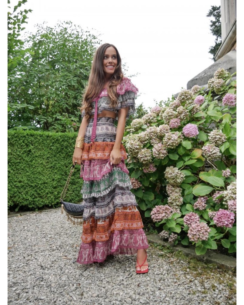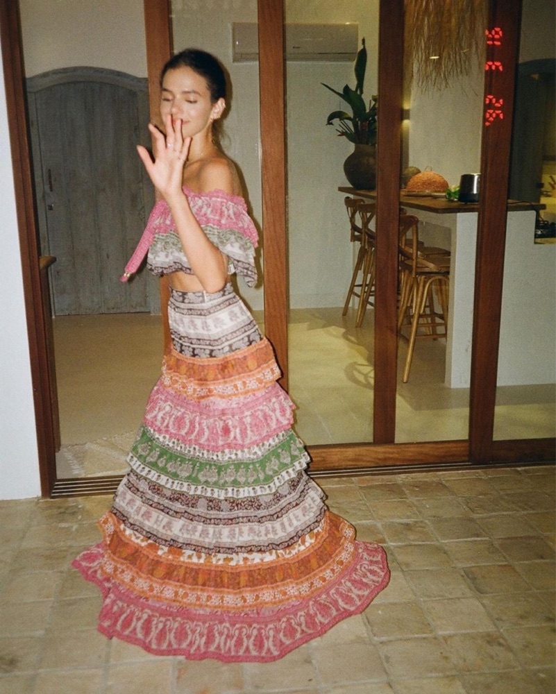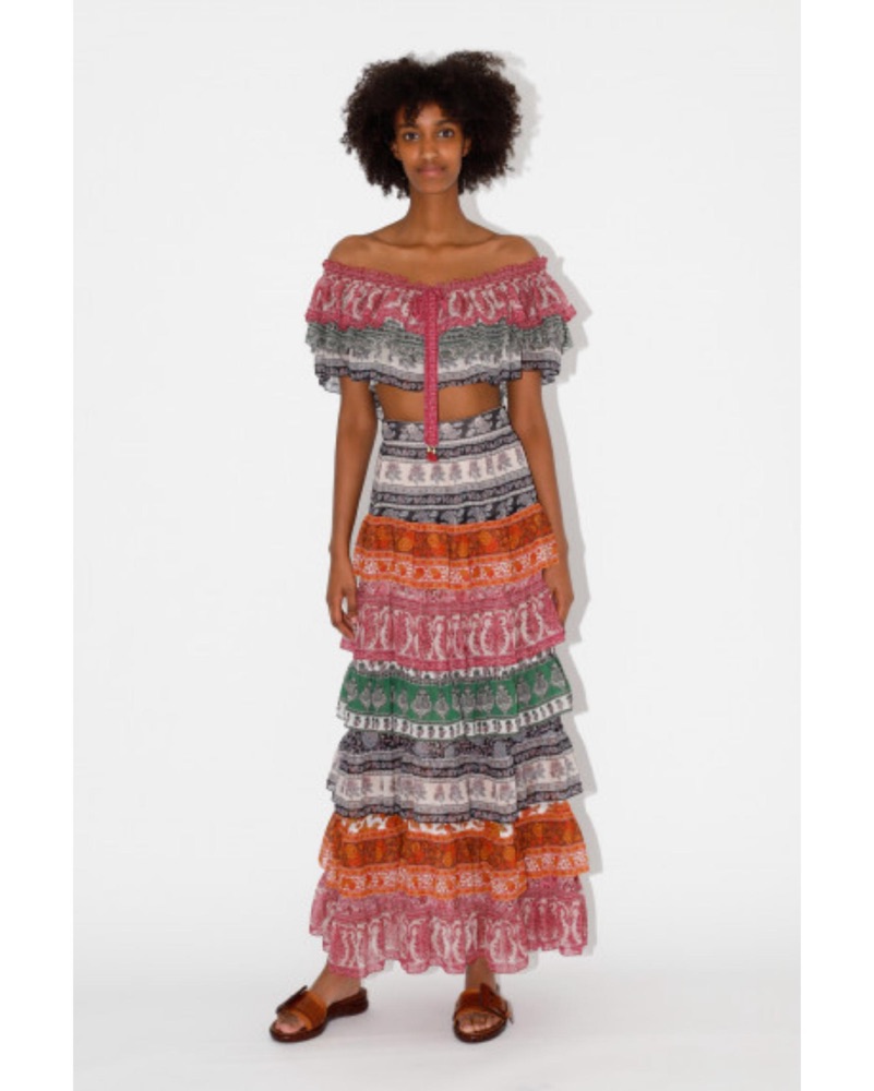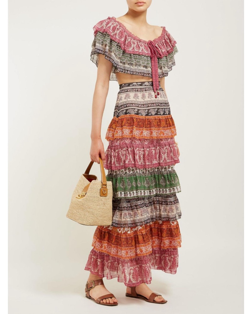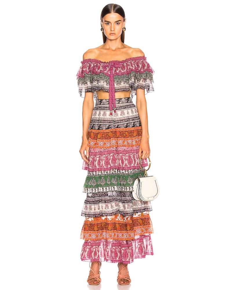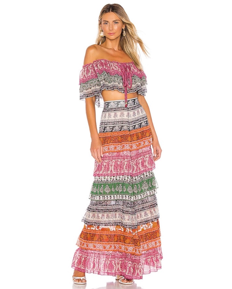Amari Off Shoulder Tiered Top $425 and Amari Tiered Maxi Skirt $795. Top is size Zimm 0 (XS) w lots of stretch - skirt is Zimm 1 (S). Skirt measures approx 42" in length. Invisible zip closure at left side. Model is 5'9" and in size S. Tags: western chic, boho chic, western dress, festival outfit