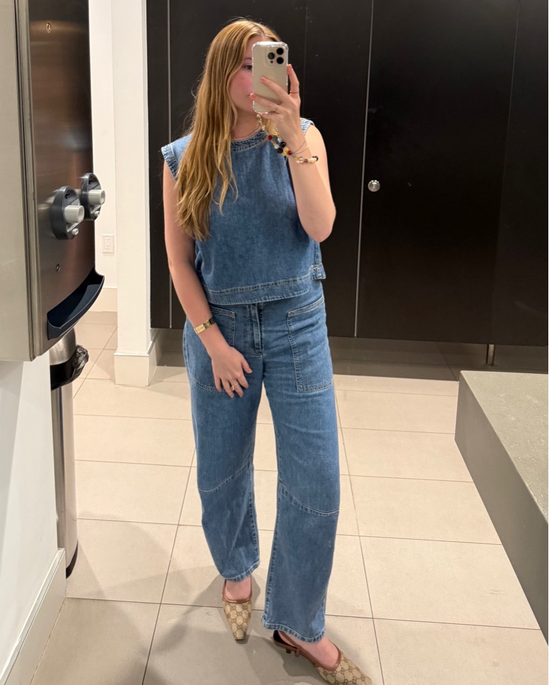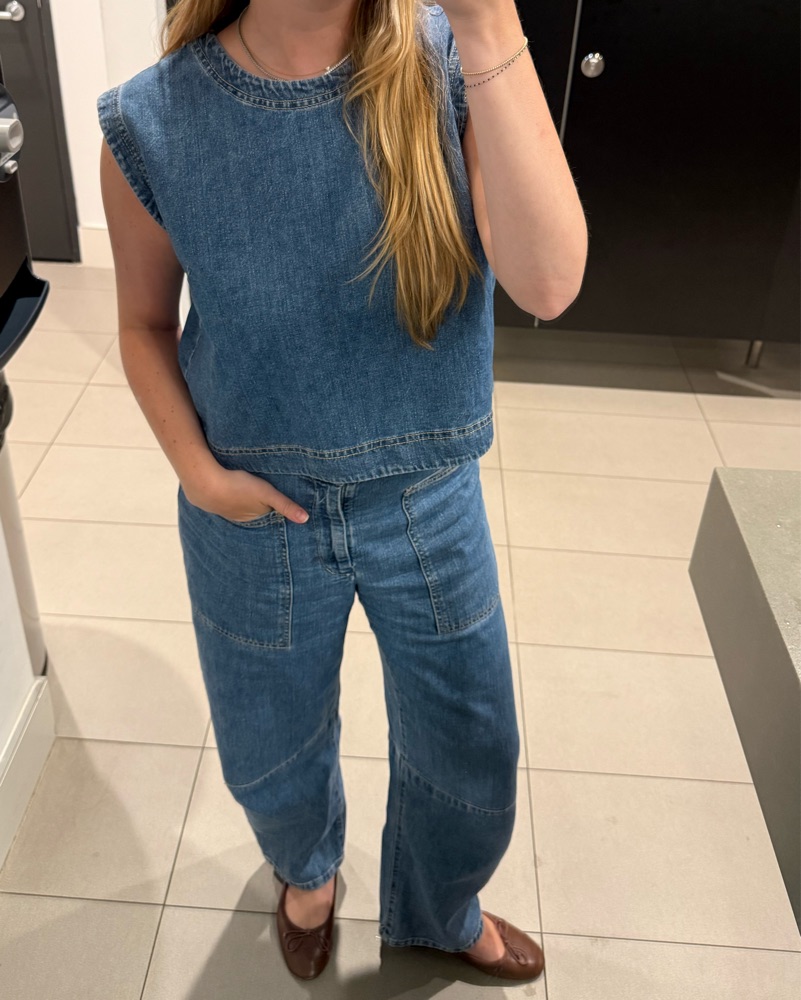 Super cute denim matching set from the brand Velvet! Denim tank & barrel leg pants, both in a lightweight denim material. This set would be so cute worn out west with a cowboy hat!