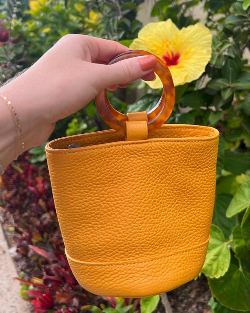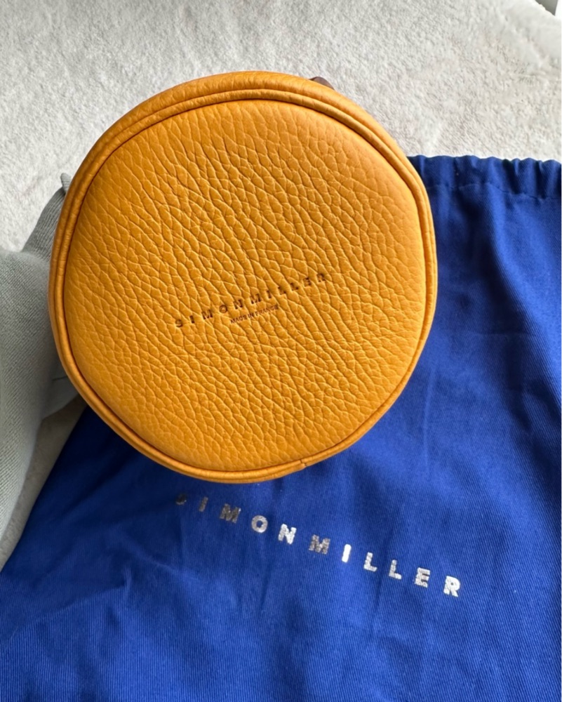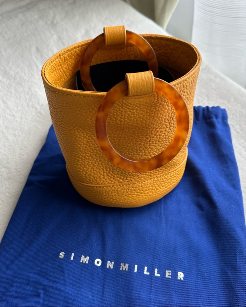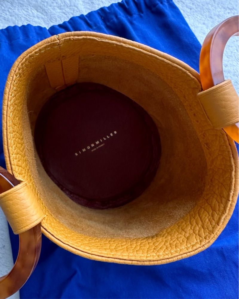 Simon Miller Mini Bonsai 15 Bag. Sunset orange leather with tortoiseshell acetate handles. A very small bag but fits the essentials (card holder, keys, lip products). Perfect for a fun occasion or vacation! 5.25" tall and 5" diameter.