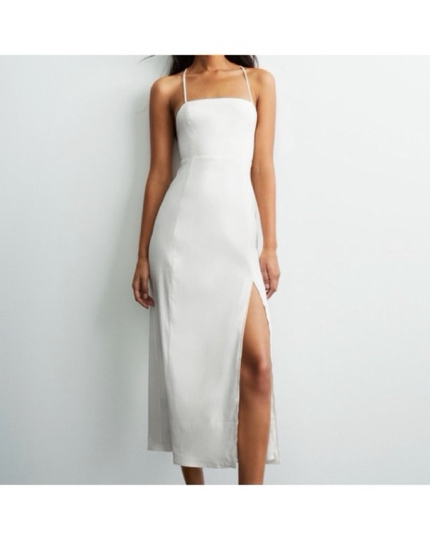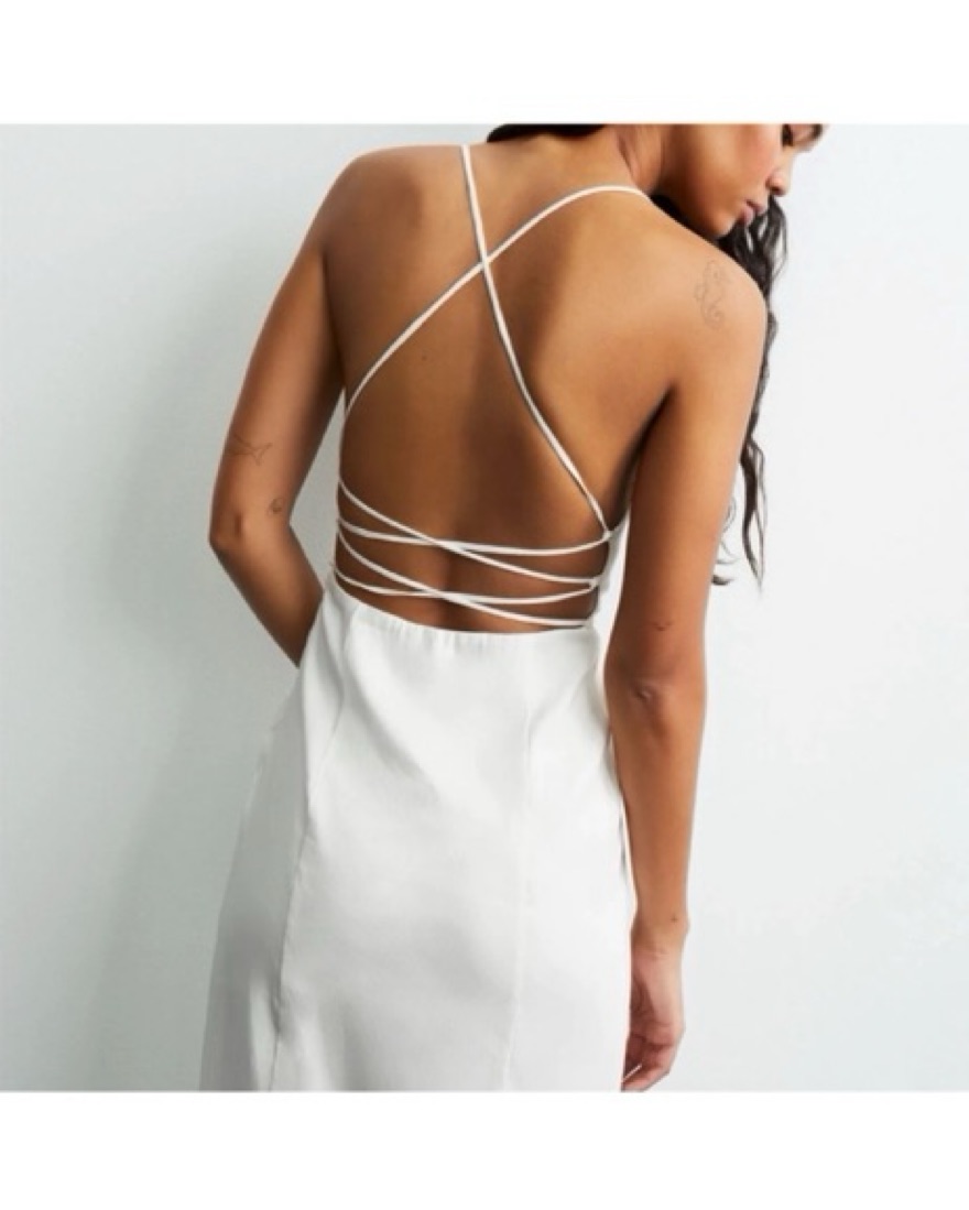 White linen dress with cross back detail. Perfect for summer or bridal event!
