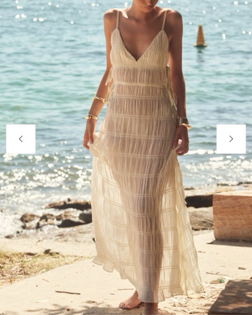 Preorder only online! Size small sheer maxi dress in cream ties on side - stretchy if you need to size up or down