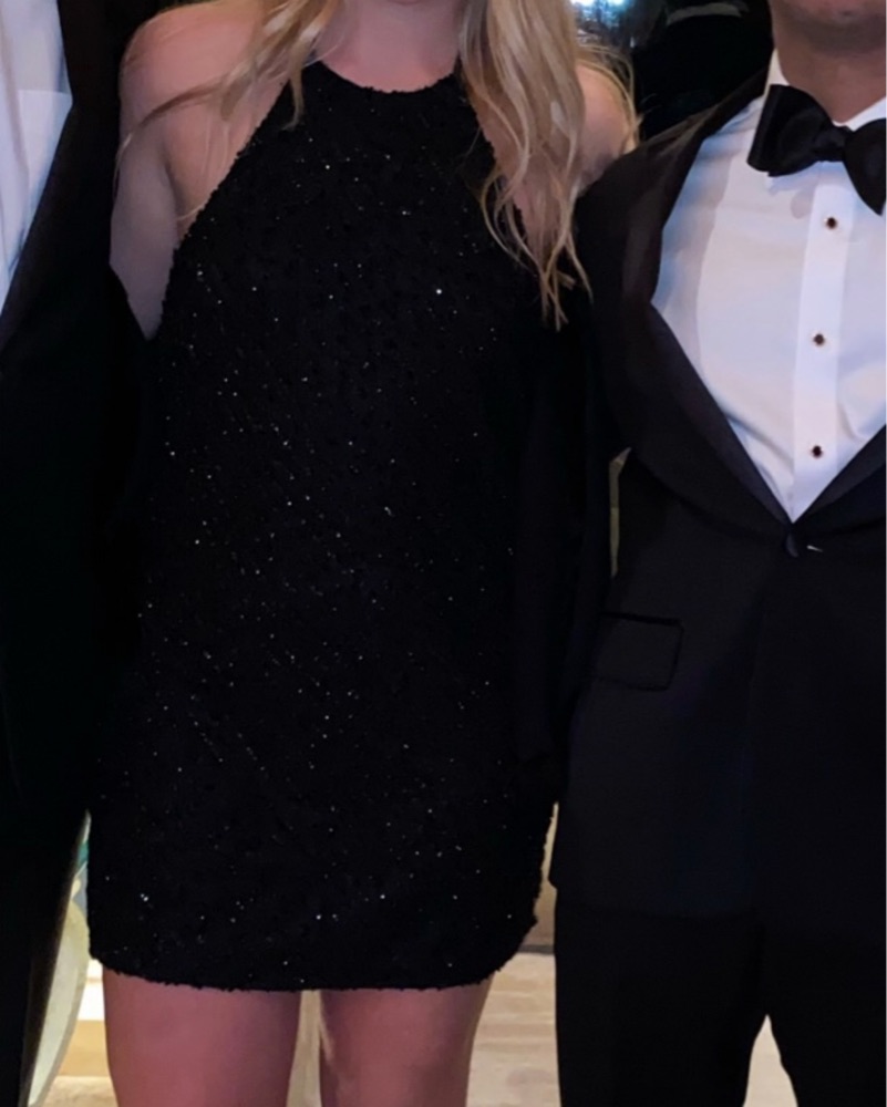 Halter low back mini dress. Metallic black. Great for holiday parties, New Year’s Eve, birthday, celebrations. Party dress!
