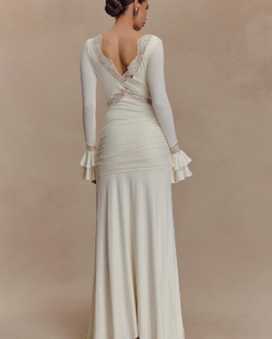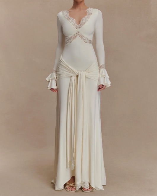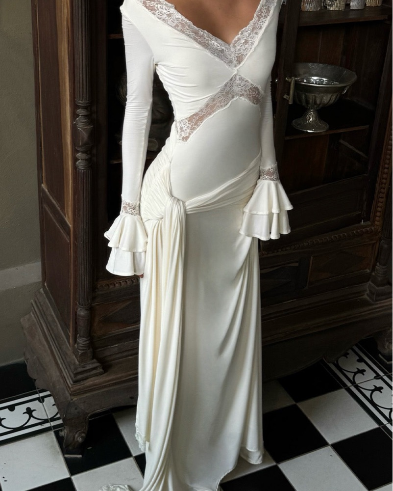 Featuring a deep V lace neckline and fitted silhouette, this dress hugs the body while lace cut-outs add delicate intrigue. A cascading front-side tie drape brings graceful movement, while flared layered sleeves evoke a sense of vintage romance. Partially lined for contrast and comfort. Worn once!