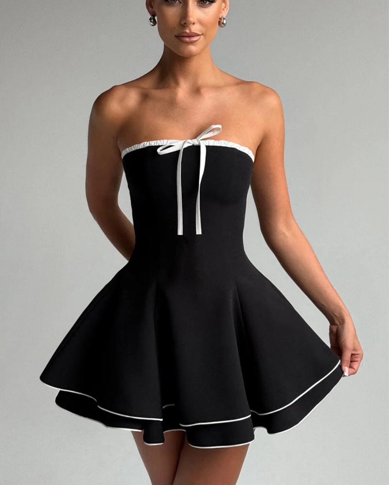 Adorable strapless flare mini dress in black and white with front bow detail. Tulle under the skirt to give flare effect.