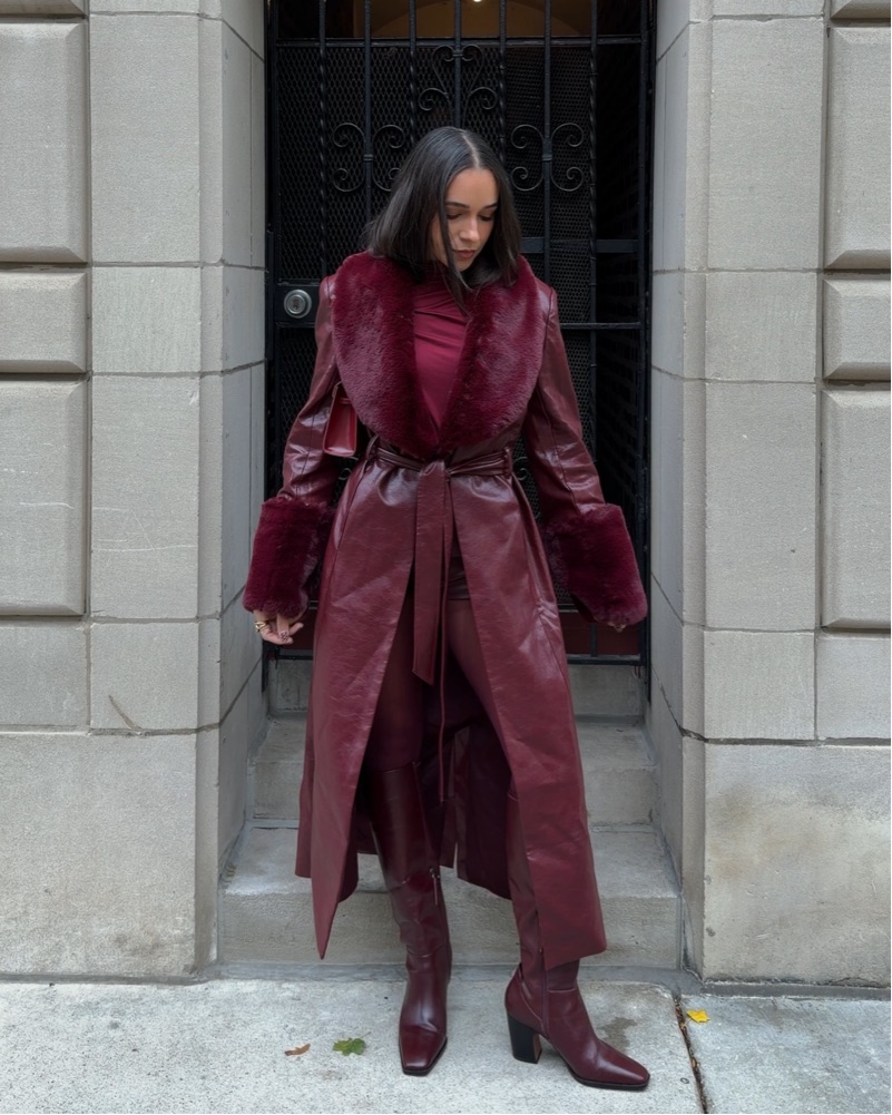 Long Burgundy Faux Leather Jacket by Meshki - Pickle