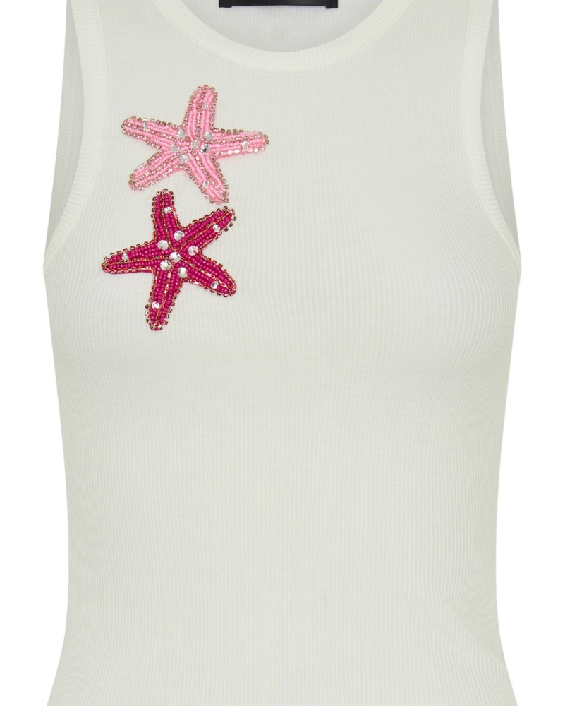Robbed white tank with pink starfish beaded details. High neck and thick straps, can be dressed up or down!