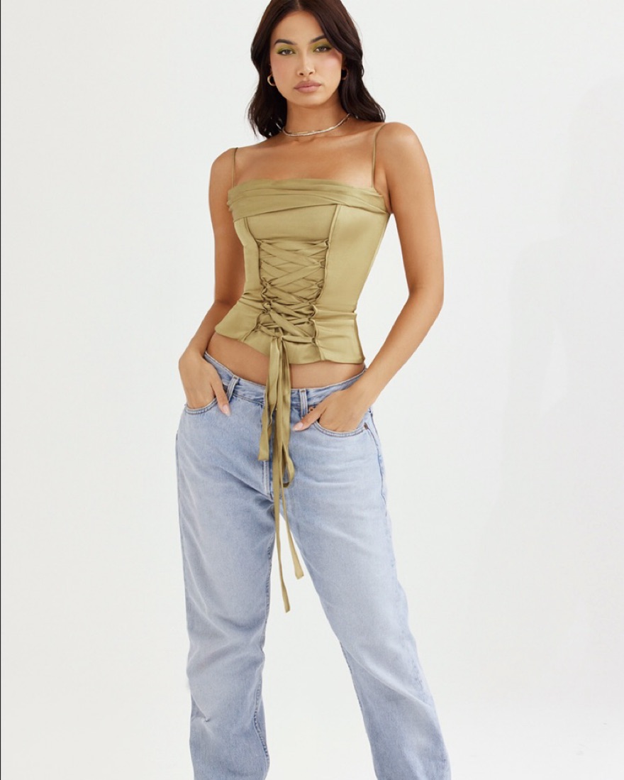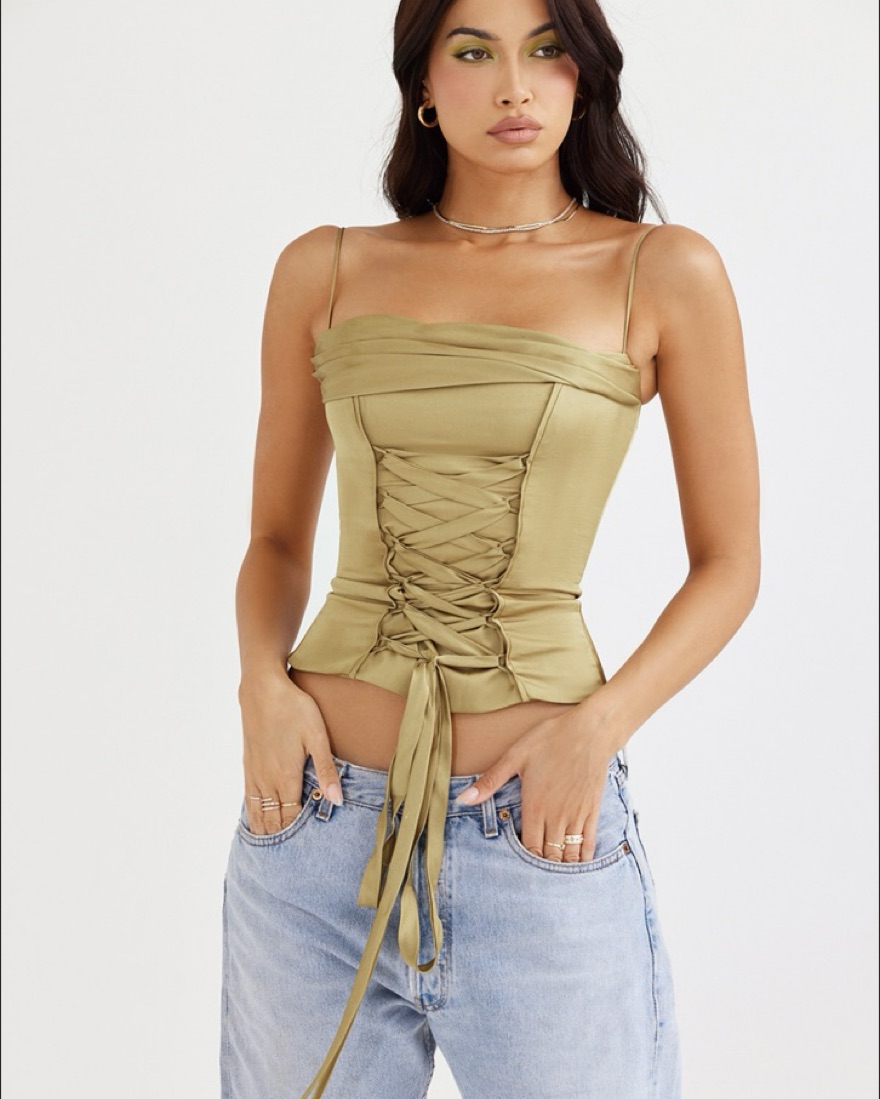Sage green satin lace - up corset with adjustable straps, zipper in the back. This top makes you look SNATCHED! Perfect for a night out/ date night! Worn by Emiy Ratajkowski! Price includes dry clean.