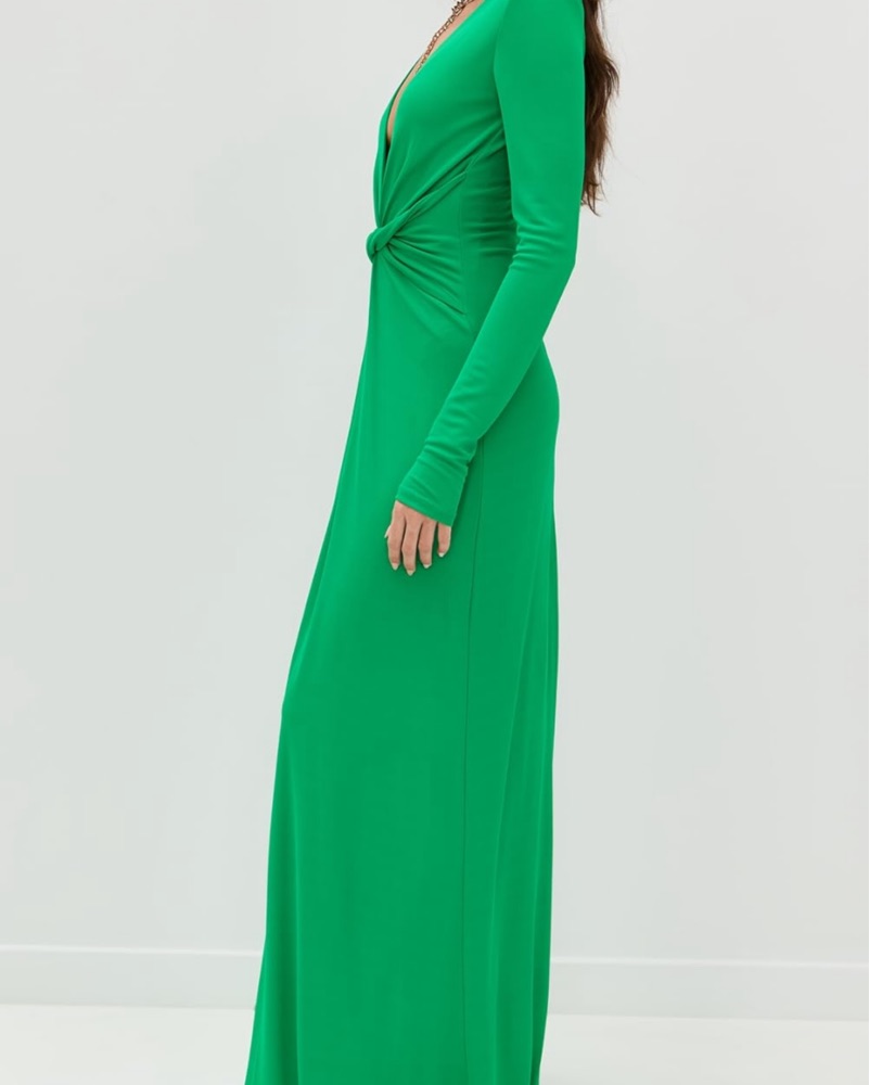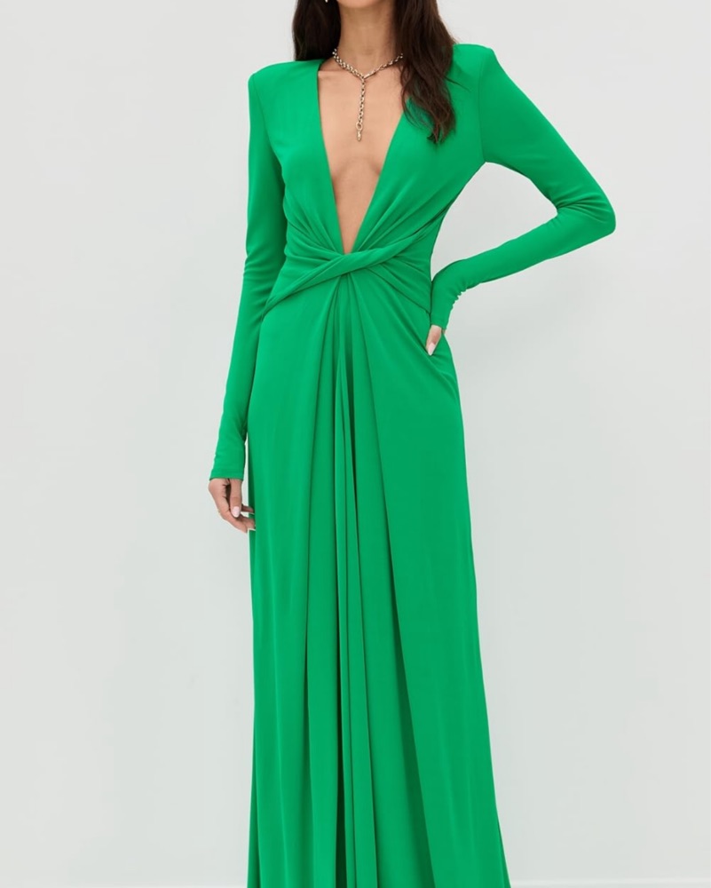 “bright palm” green gown | long sleeve | plunging vneck | padded shoulders (i removed but they can be added back in). Size 00 but stretchy so will fit 00 to a small 2, listing as XS