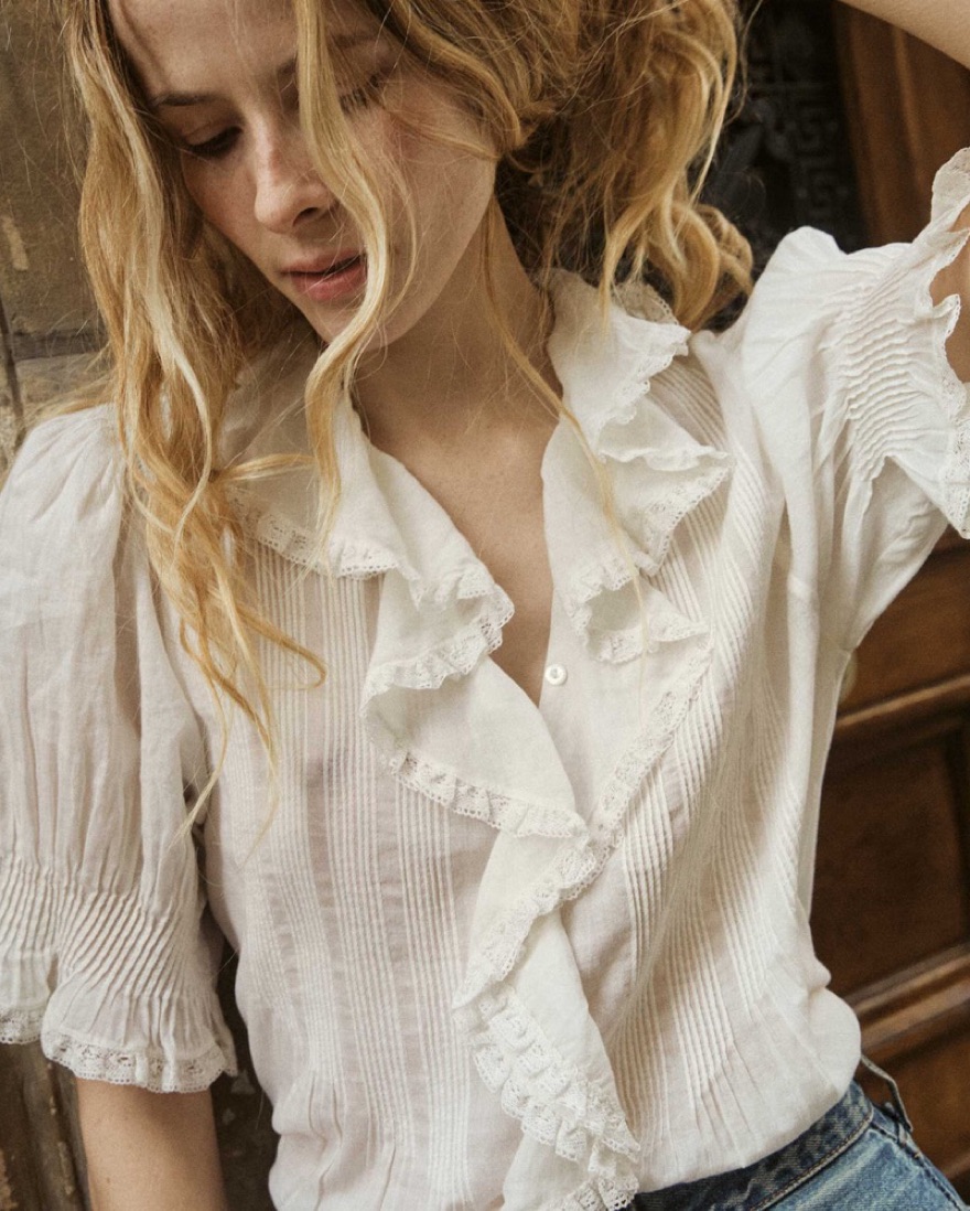 Crafted from the softest organic cotton. It features a plunging V-neckline framed with cascading lace-trimmed ruffles that extend down the bodice and delicate clustered pintucks at the yoke, back, and short puffed sleeves.