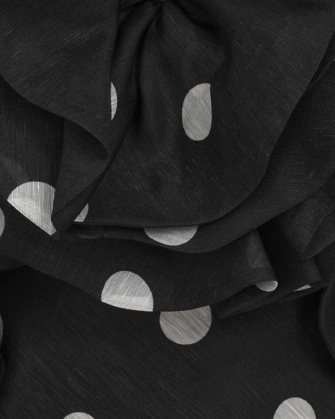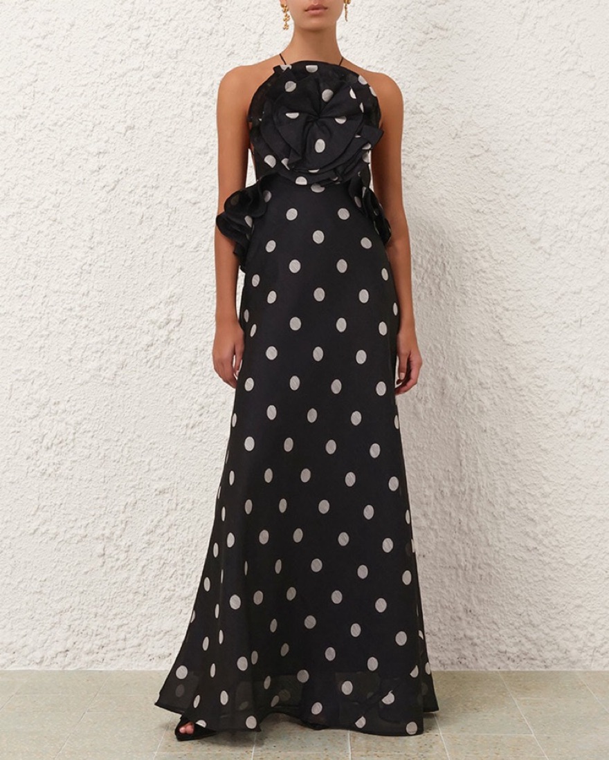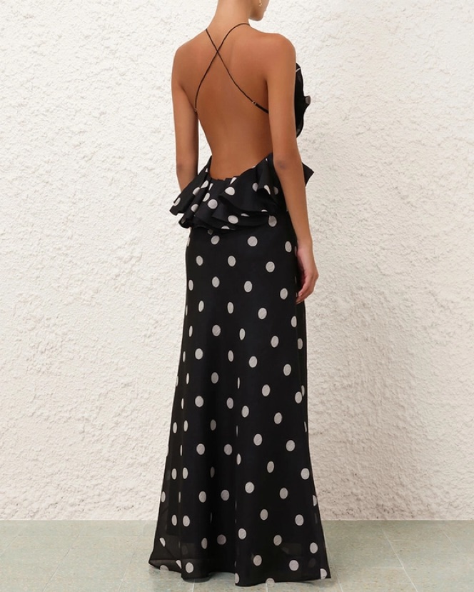 The Crush Ruffle Halter Maxi Dress in Black/Cream Dot from our Resort 2025 Collection, Crush. A silk linen backless maxi dress featuring statement ruffle detailing at the bust and side edges, adjustable criss-cross back straps and an in. Size 0 (US 2-4) small
