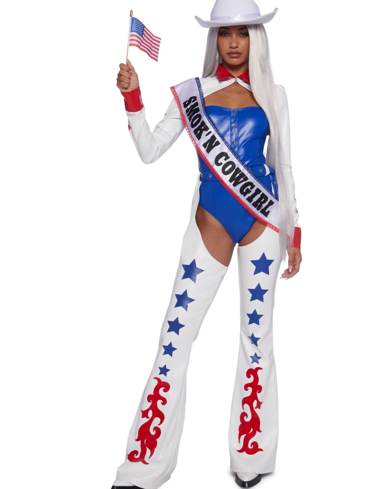 Includes bustier, chaps, hat, wig, sash and flag. Perfect for Beyonce concert
