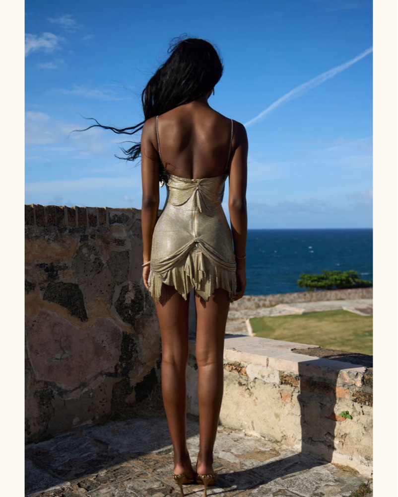 Currently unavailable - damaged by renter. THE ULTIMATE BIRTHDAY DRESS! Gold brass chainmail dress featuring cowl neck, chain straps, a clasp, a heart and lock key detail, and a center back zipper. Unlike most chainmail dresses, this dress is fitted to the body, creating the signature snatched look.