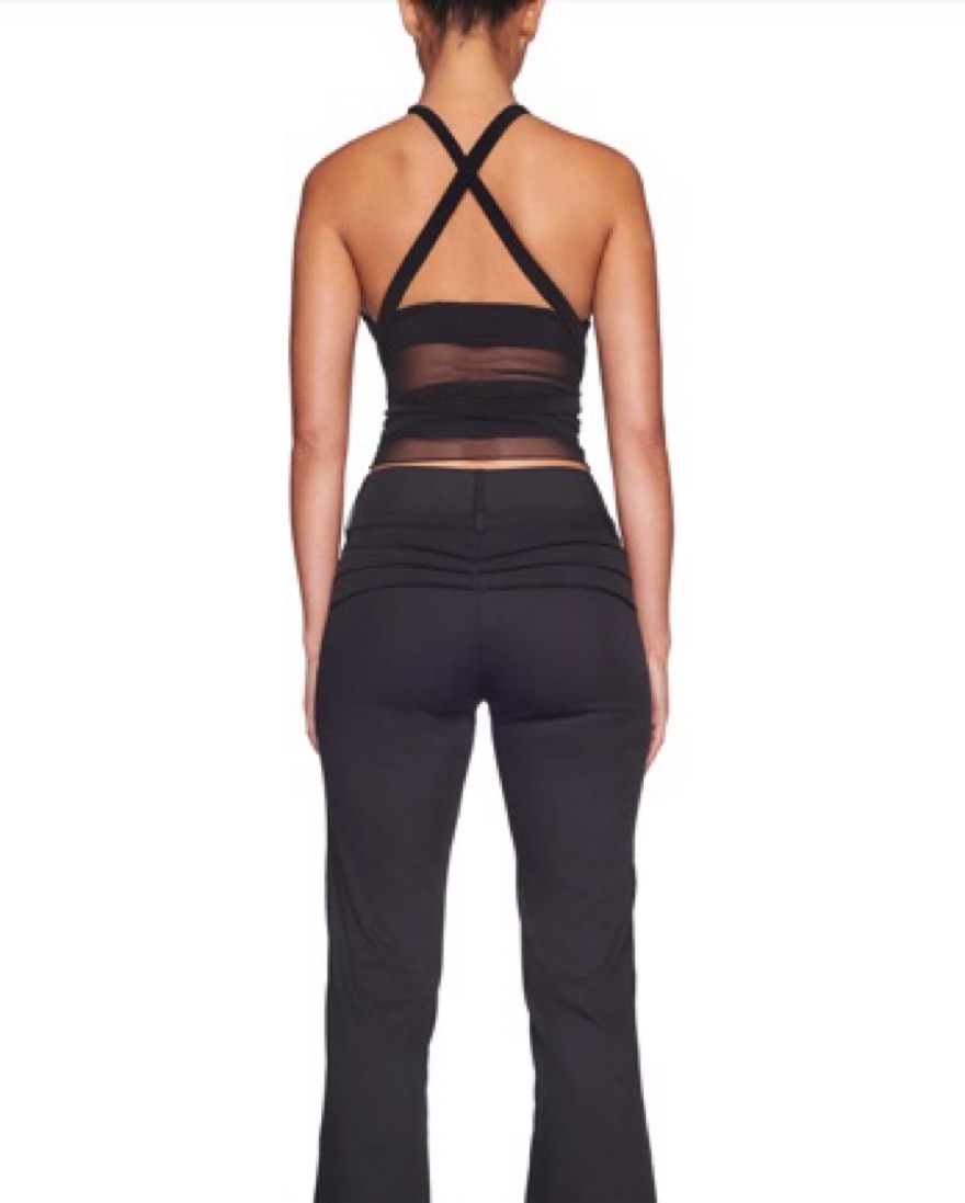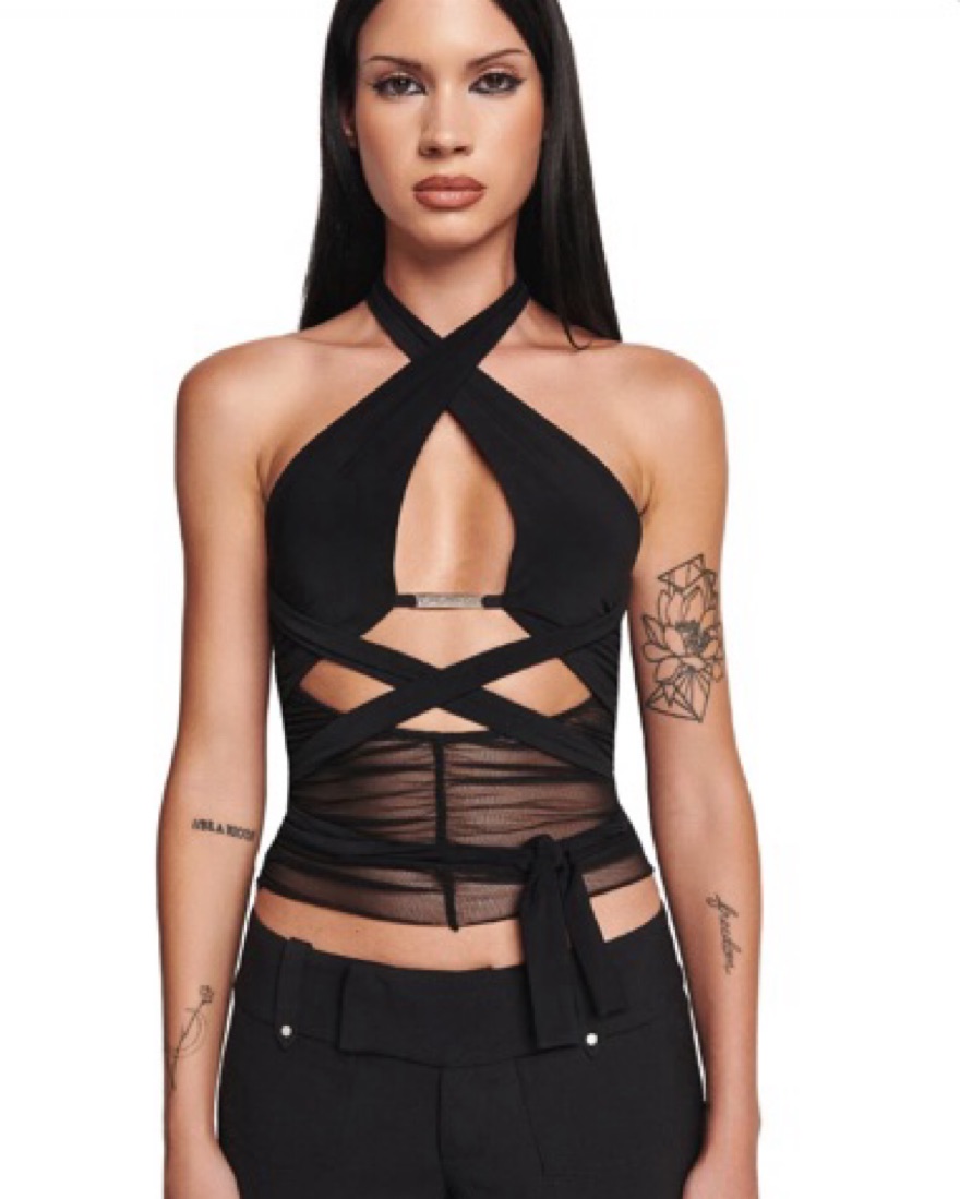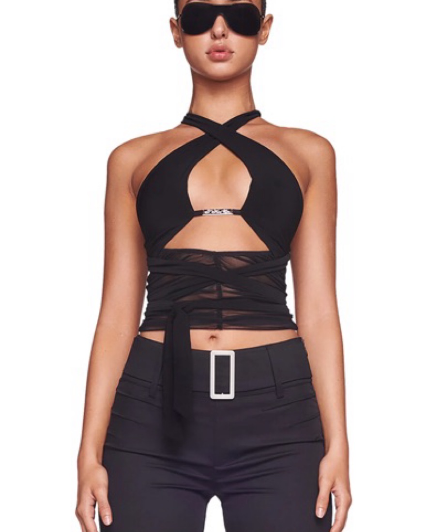 Black multi tie sleeveless wrap top✨Features solid black bust panels that cross over front bust and true tie at back and waist✨Features custom 'GIA' silver embossed hardware at front under bust. ✨ size: S