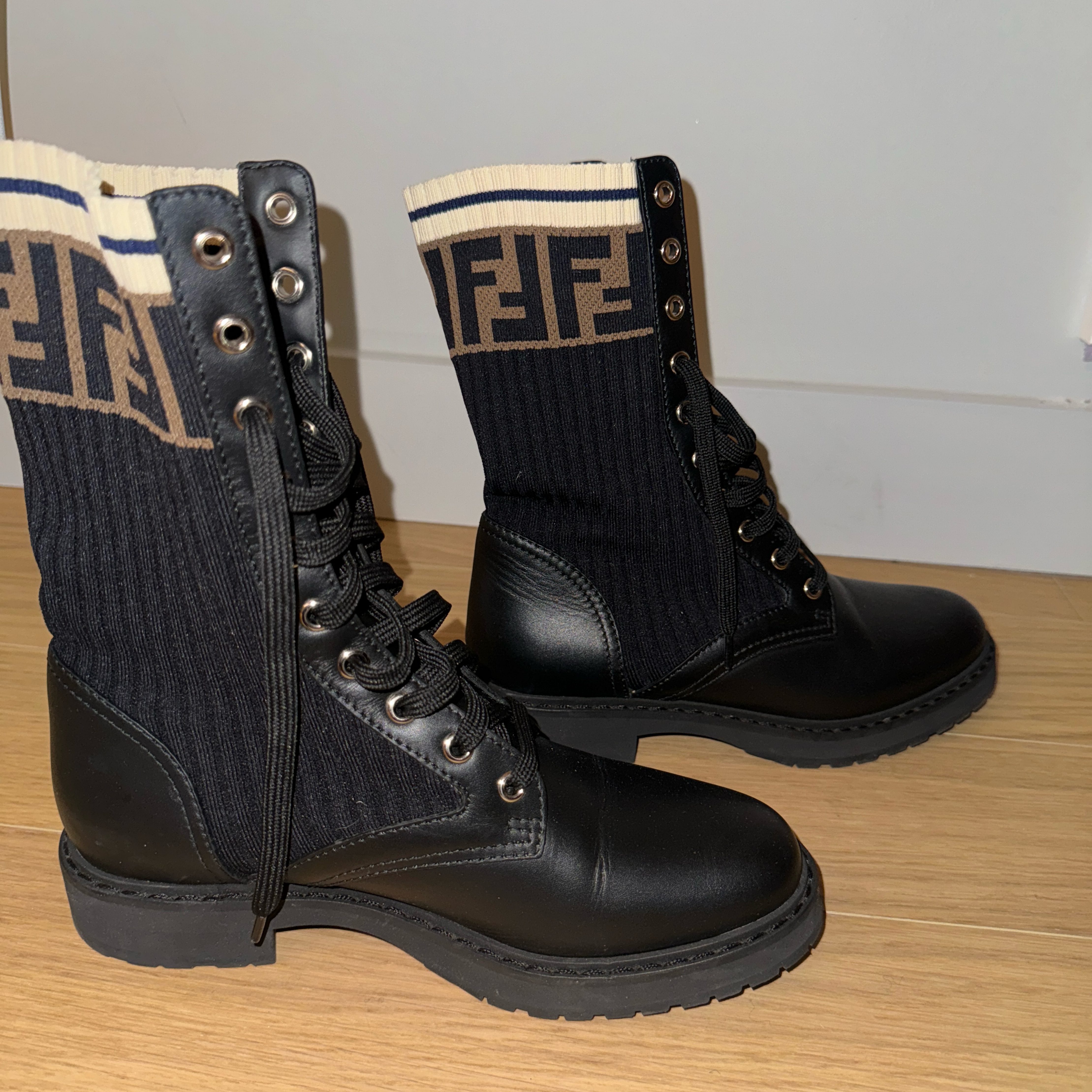 Leather combat boots with stretch fabric inserts. Non-slip rubber sole. Made of black calfskin. The sock-like high top is trimmed with the FF motif and contrasting stripes