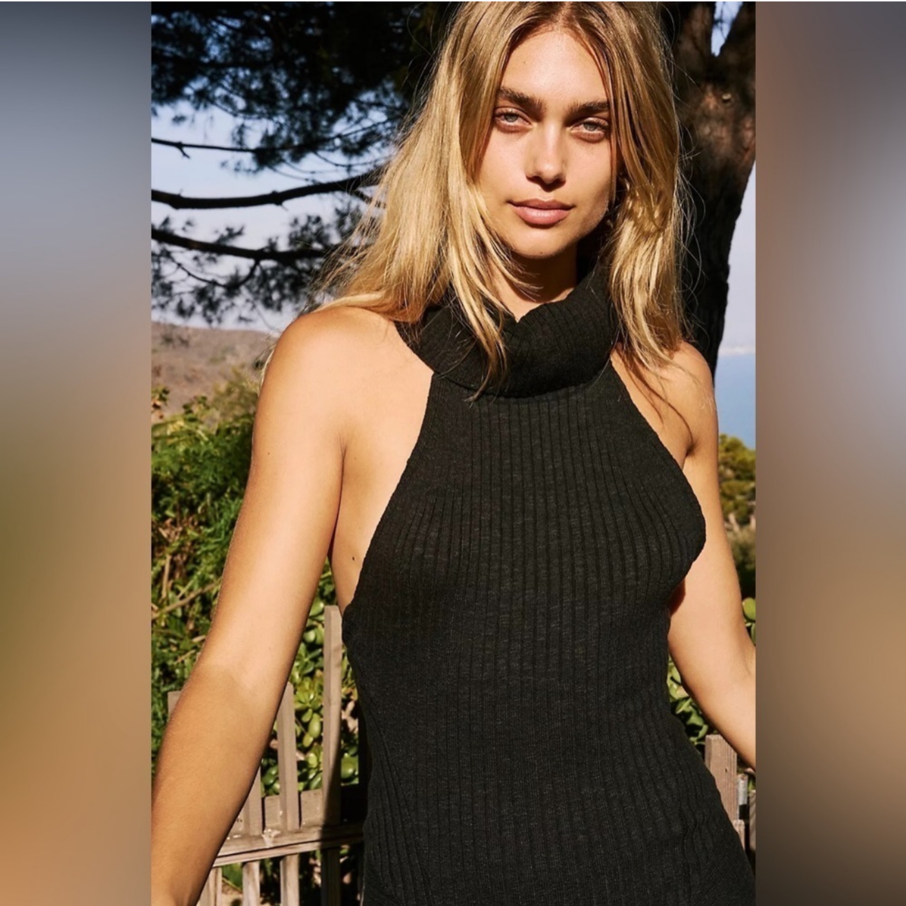 Features: Oversized turtle neckline, ribbed fabrication, sultry open back, dropped armholes