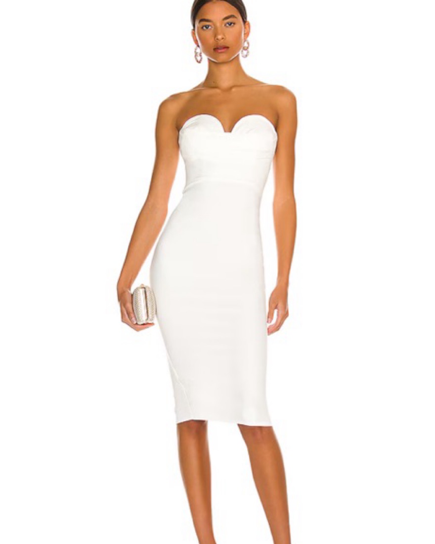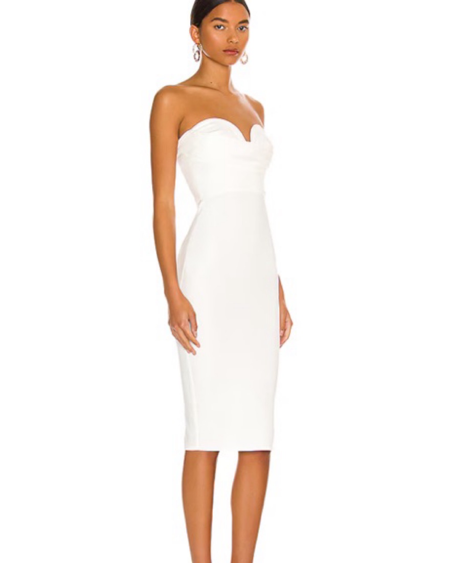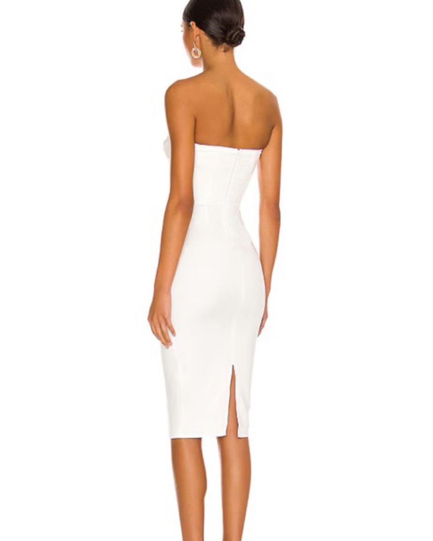 White strapless mini dress from revolve. Super flattering with sweetheart neckline and small slit in the back. Perfect for graduation.