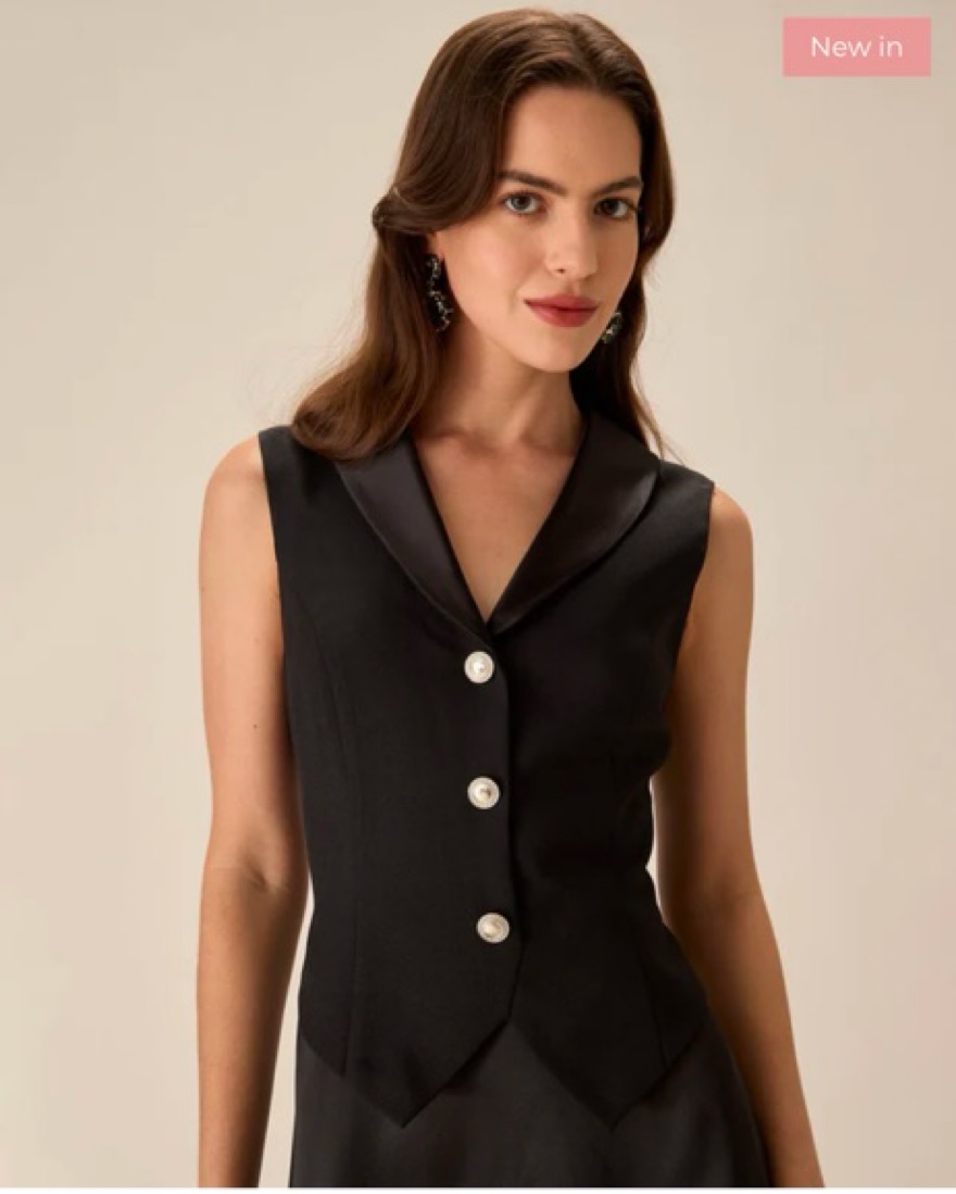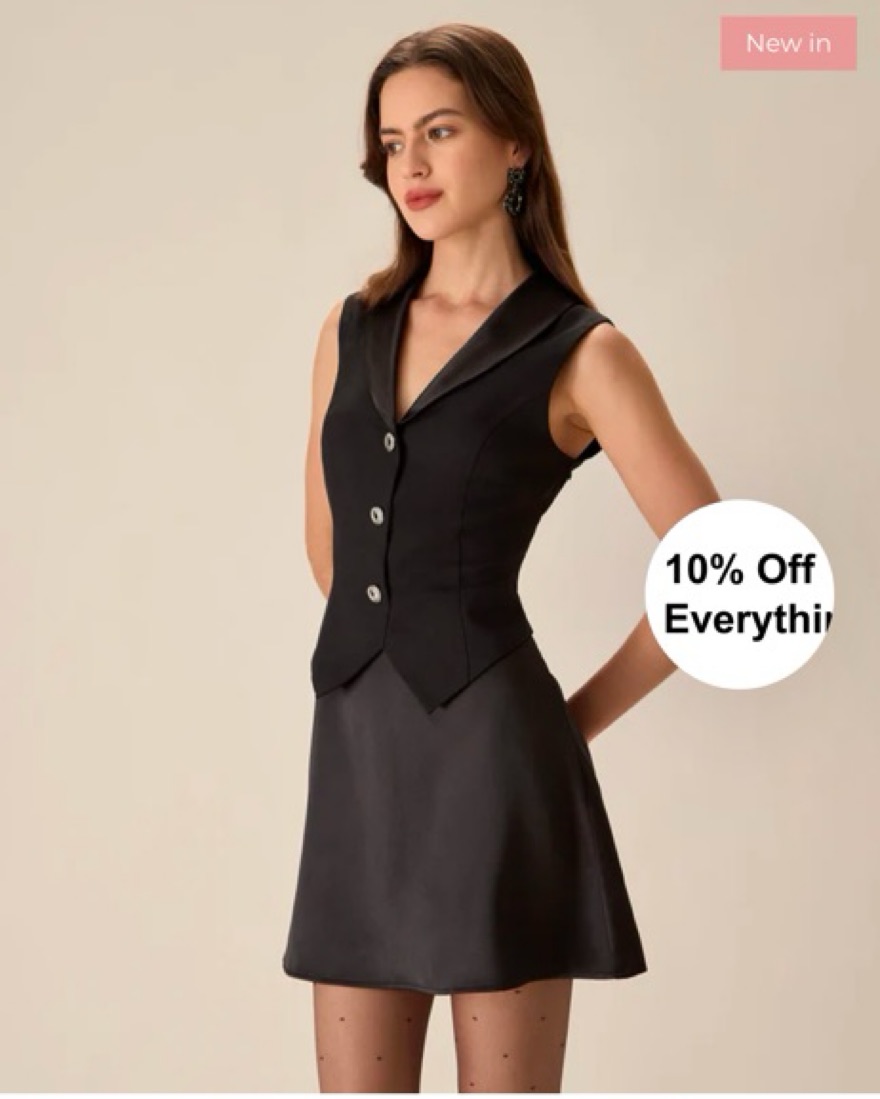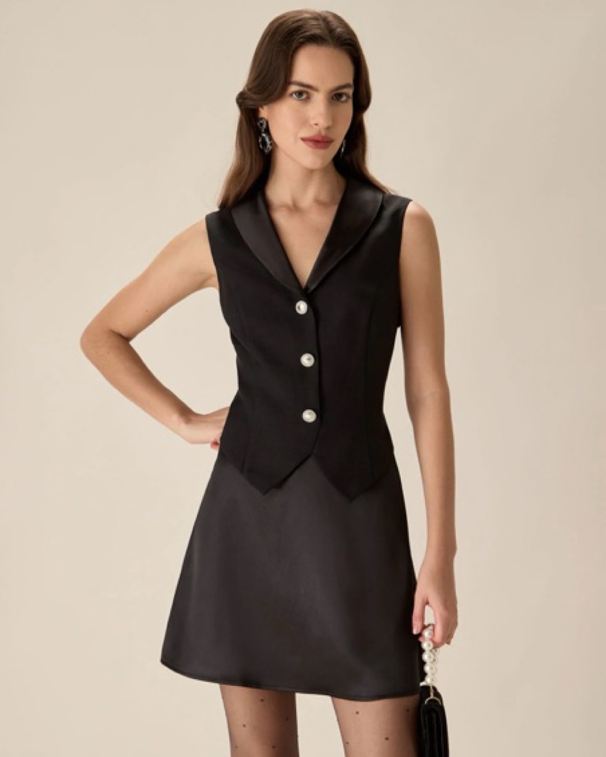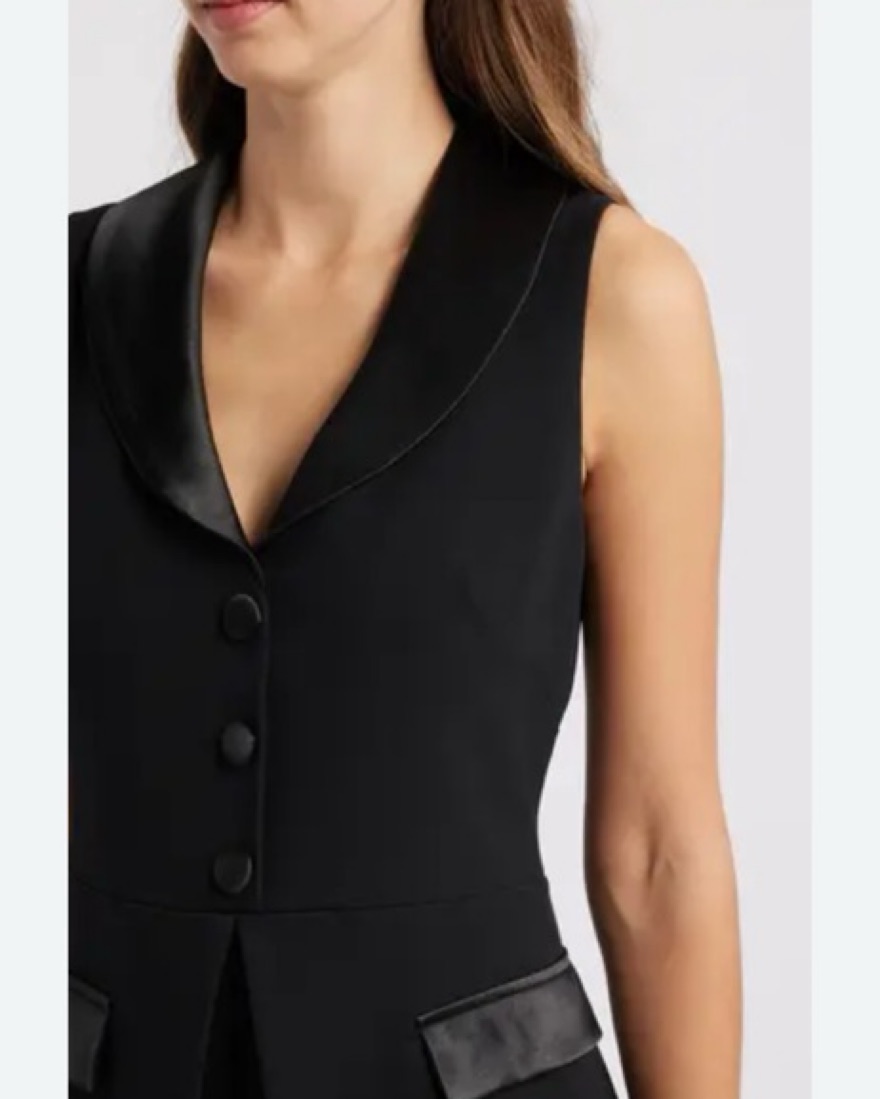This versatile black vest dress is perfect for a night out or a professional event. The tailored silhouette and sleek design give it a polished, sophisticated look.