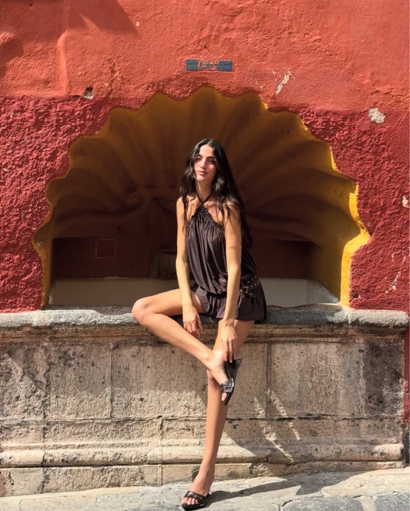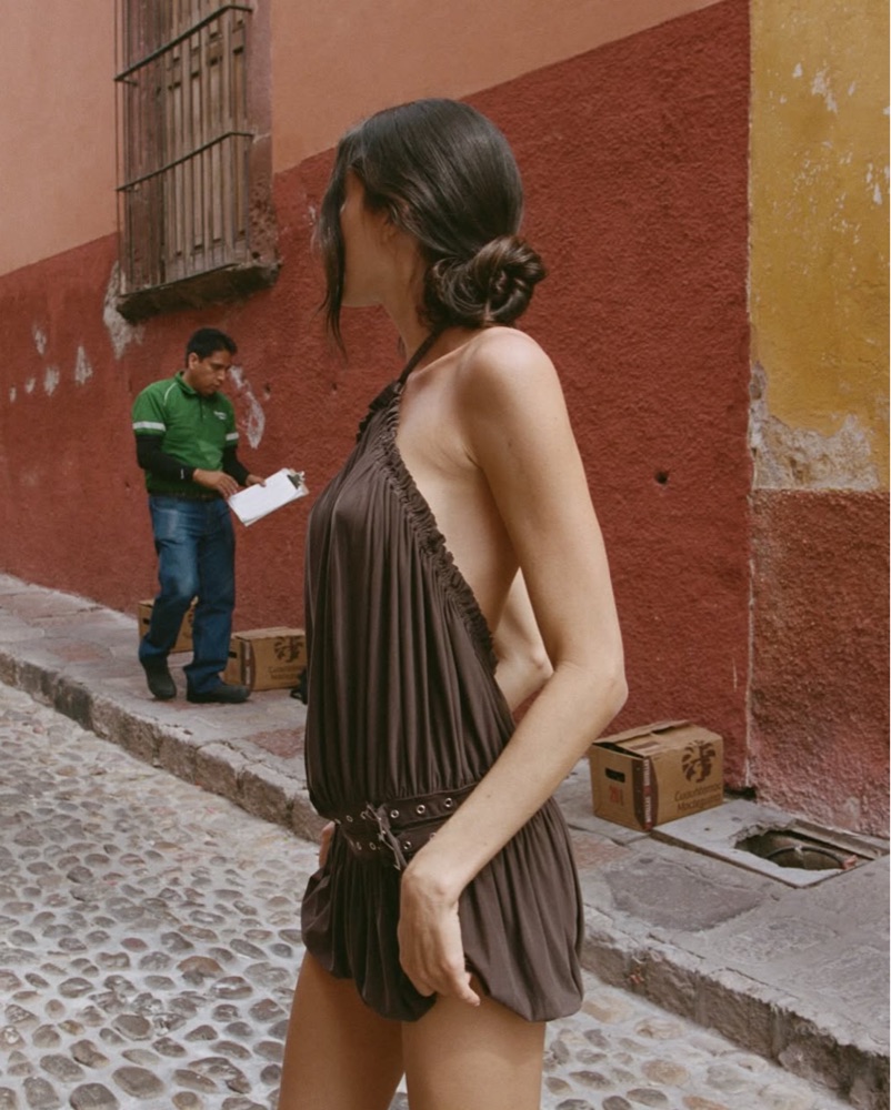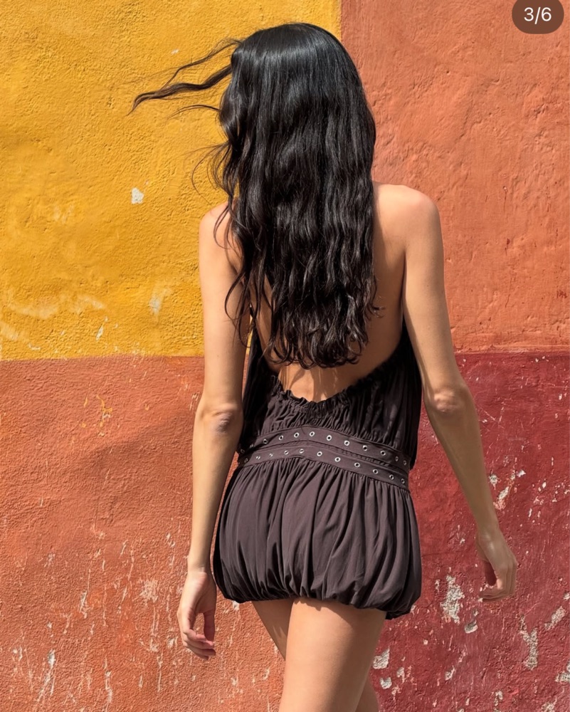 The Magnol Dress is a halter-neck dress with a self-tie strap, double waist eyelet straps with buckle details at the hip, an elasticated bottom hem, and a low back.