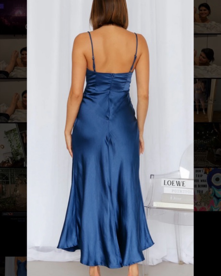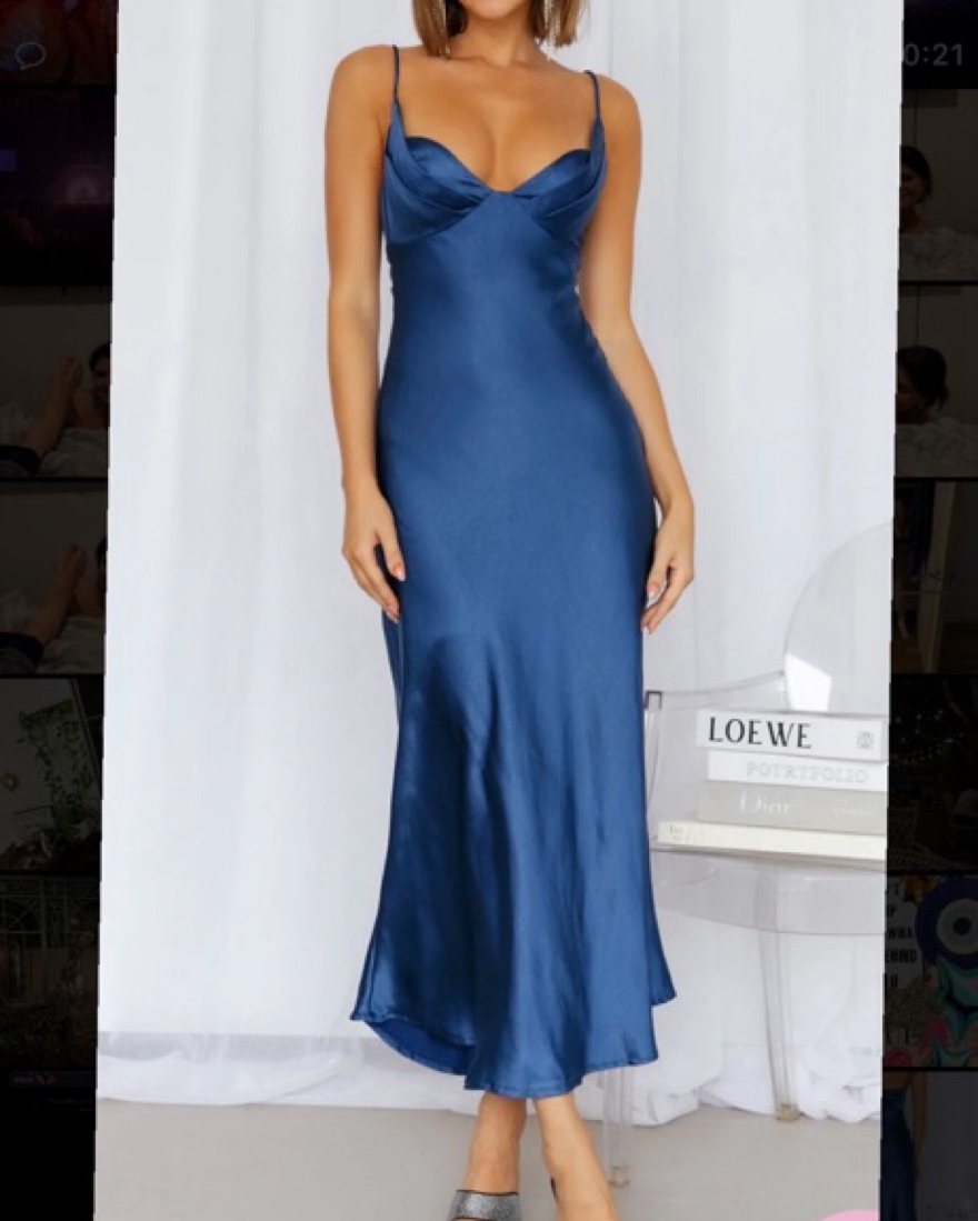 Lightweight satin maxi dress perfect for a wedding guest or night out! The cups are lightly padded on the dress.