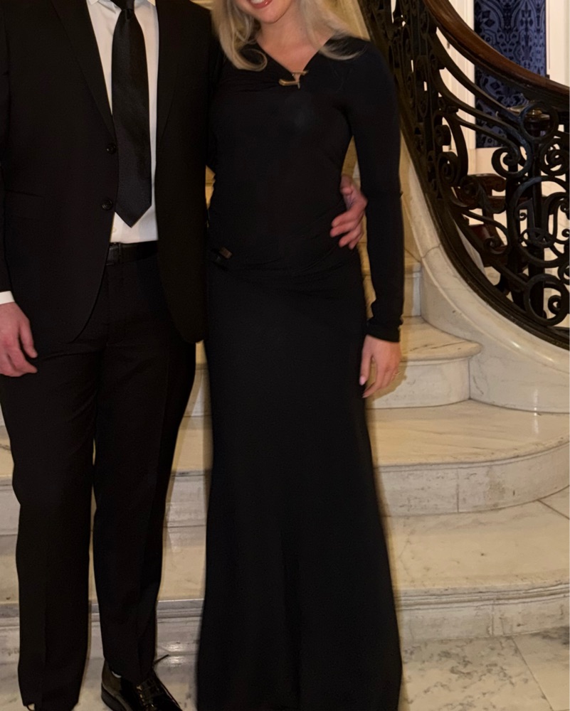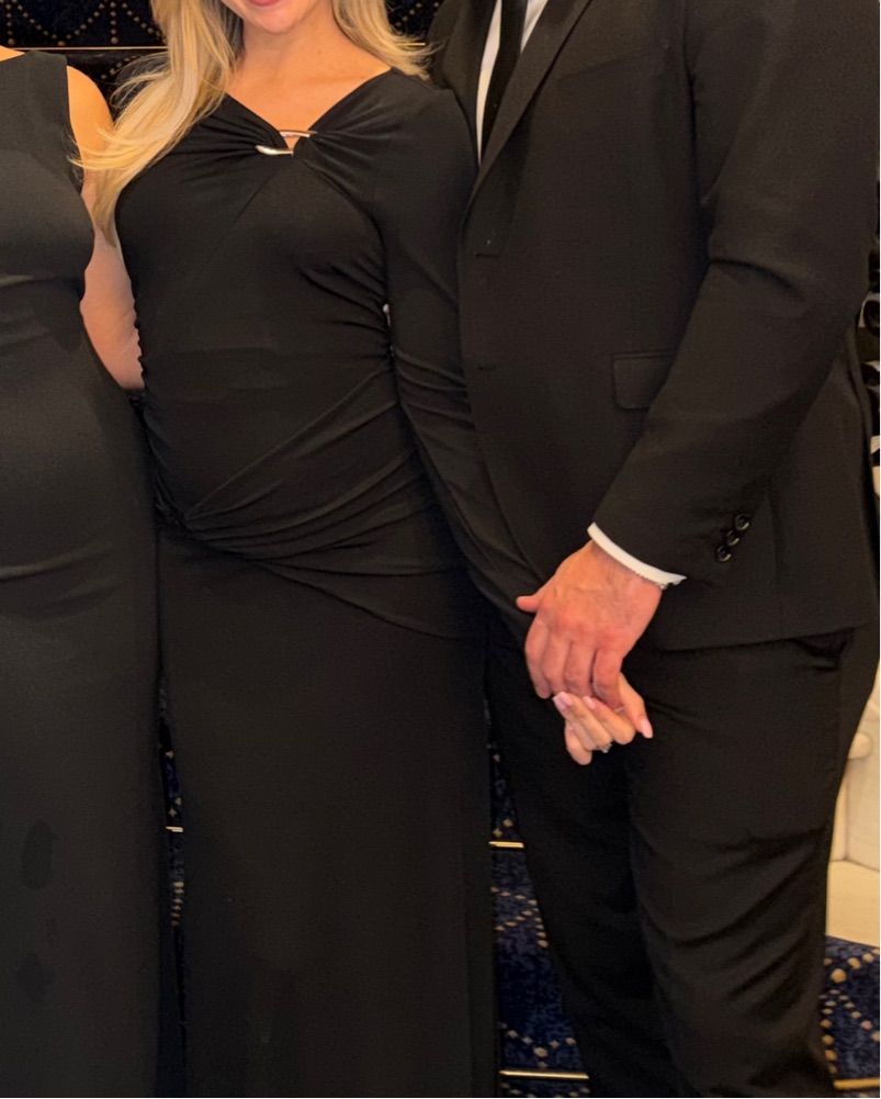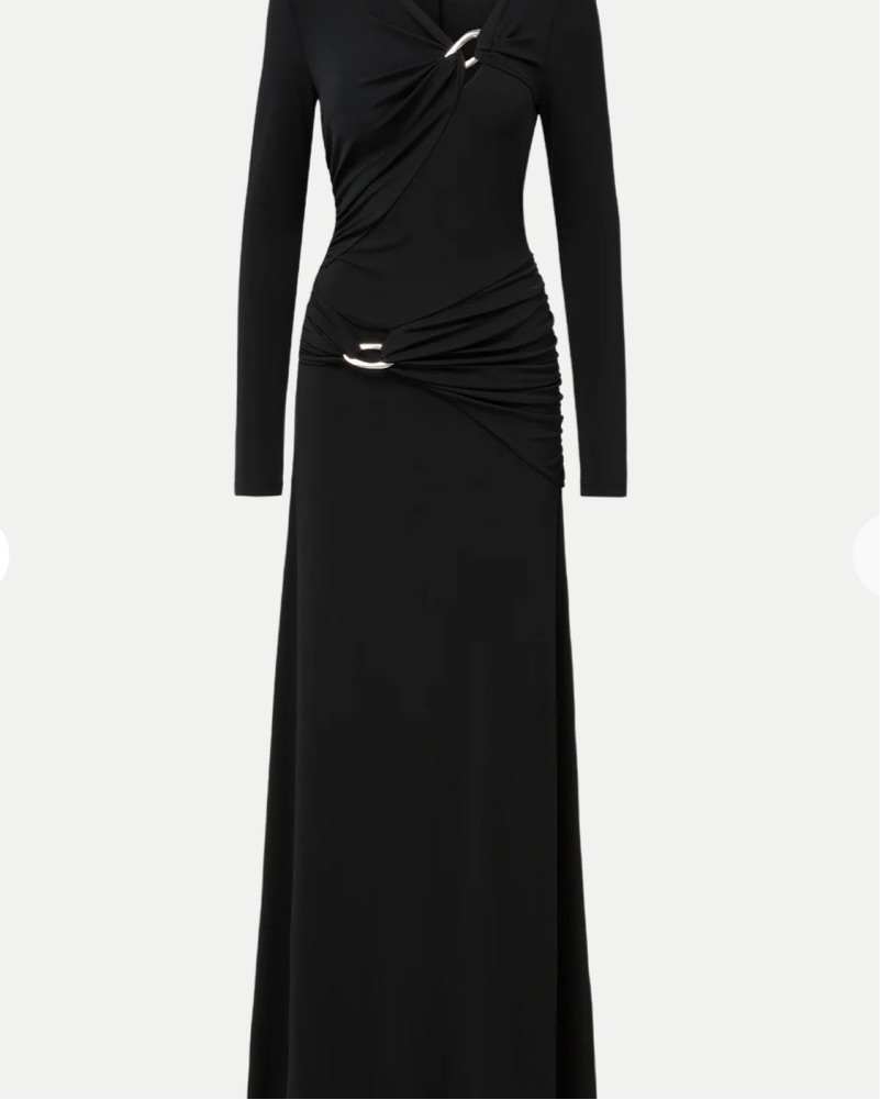 Black gown with silver ring details. Long sleeve and perfect for fall or winter events!