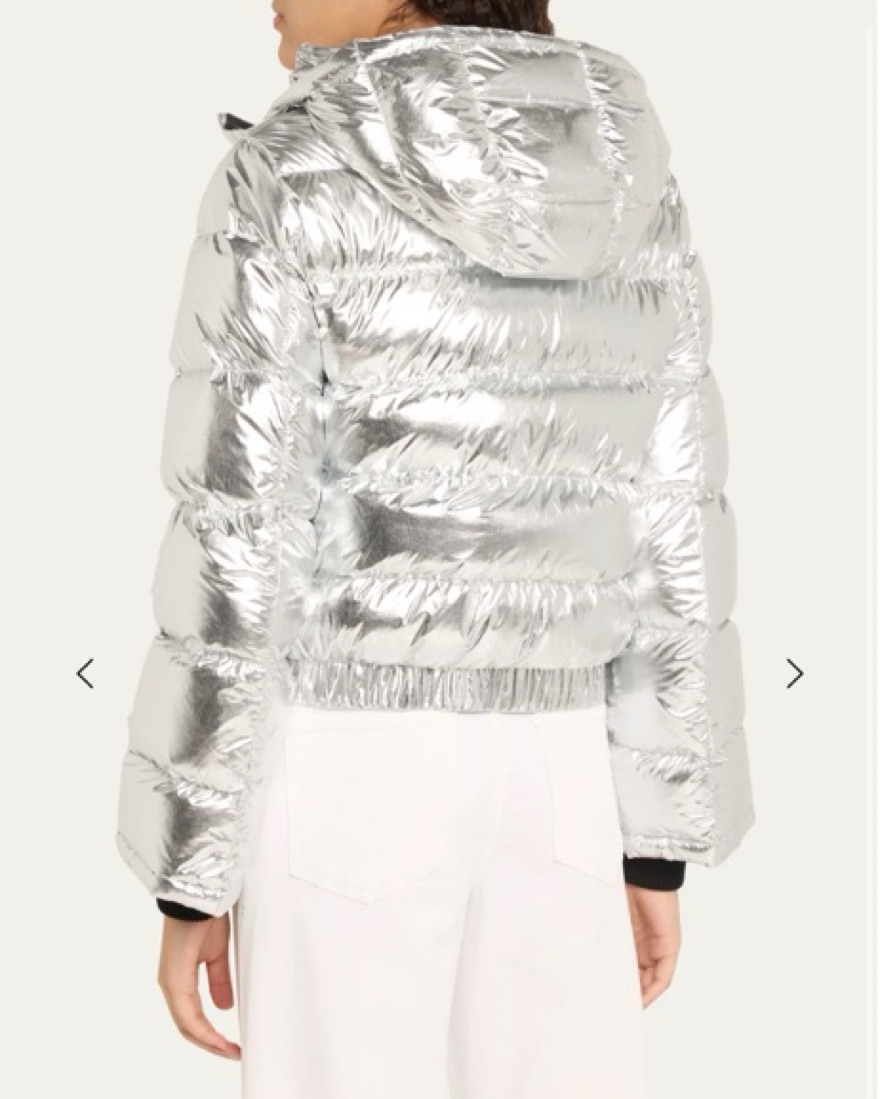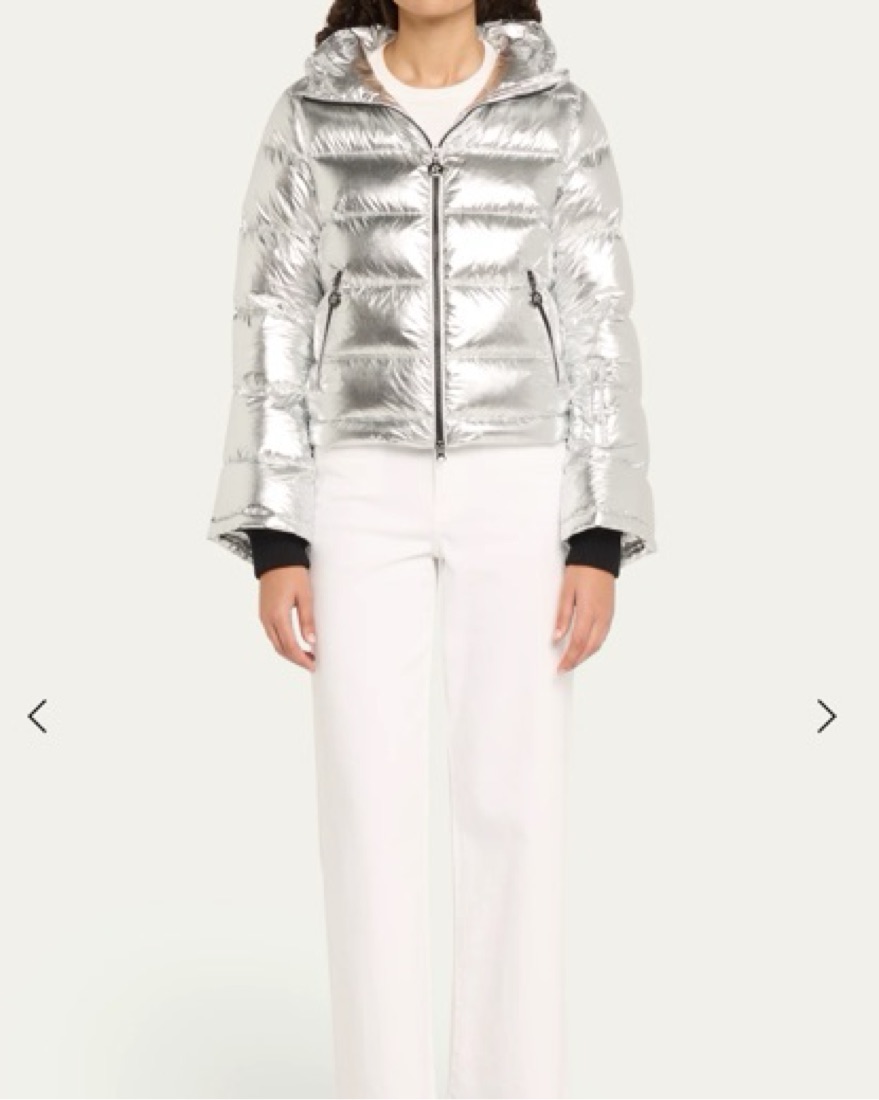 Cute silver ski jacket — better for blue bird days. Not super waterproof!