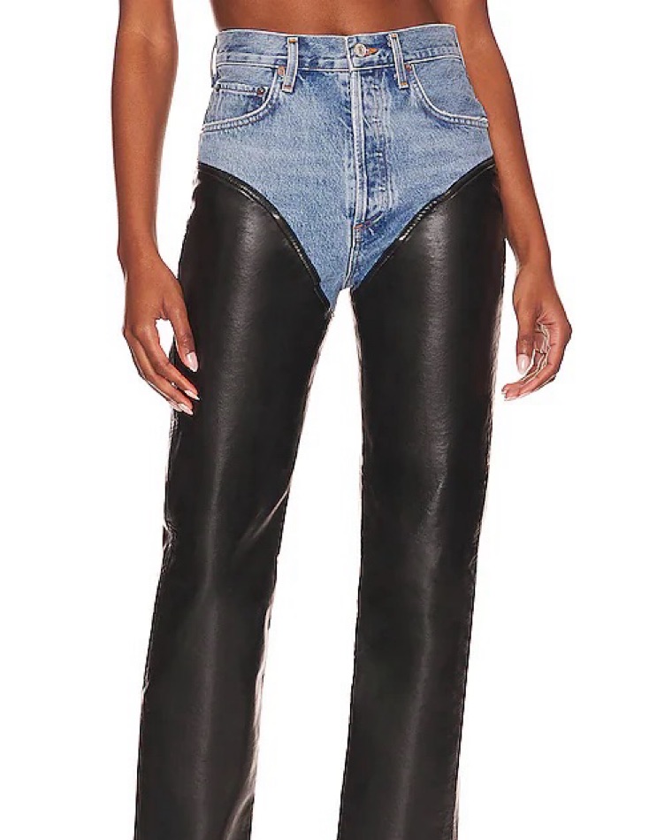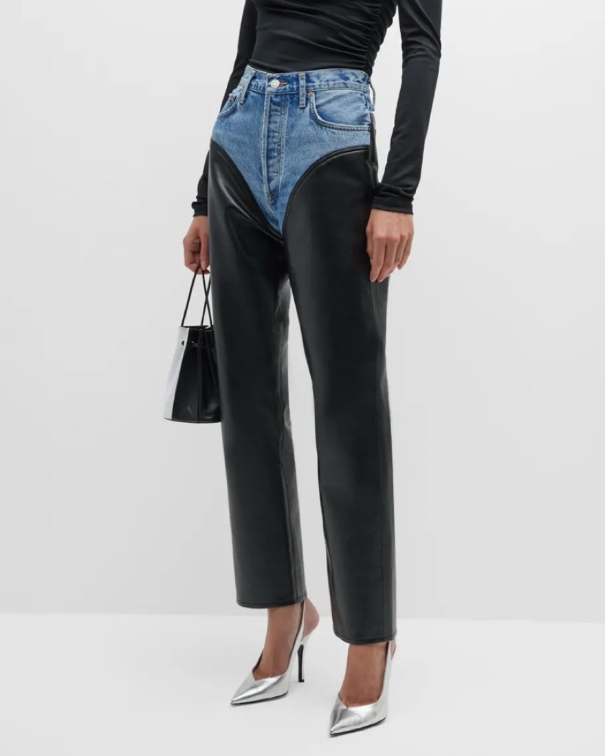 Top: 100% organic cotton Bottom: 50% recycled leather, 30% polyurethane, 10% viscose, 10% polyester Made in USA Dry clean only Button fly 5-pocket styling