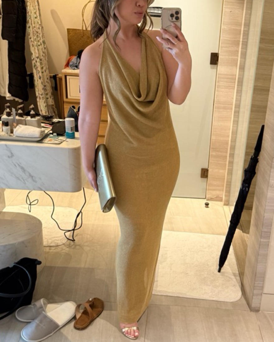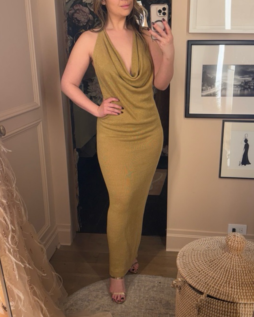 Elegant and comfy. Good stretch. Slightly sheer but if you wear skin colored undies it’s fine. Great for beach wedding or event. Gold tan color with a hint of green. Brand is Urban Zen by Donna Karen. See my profile for my measurements.