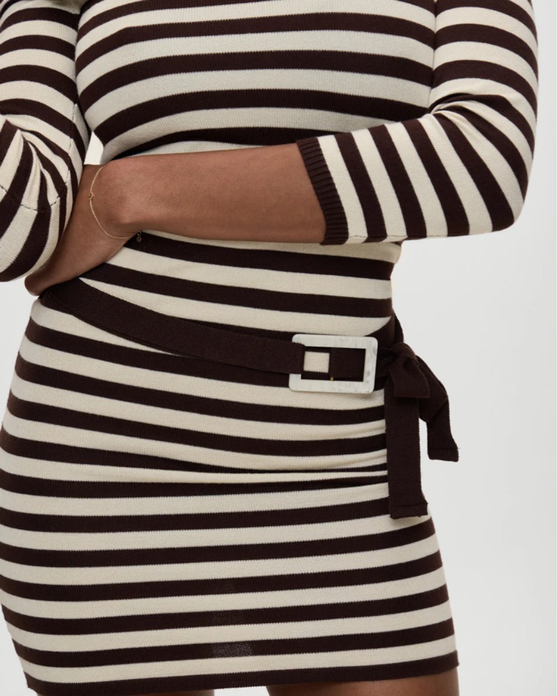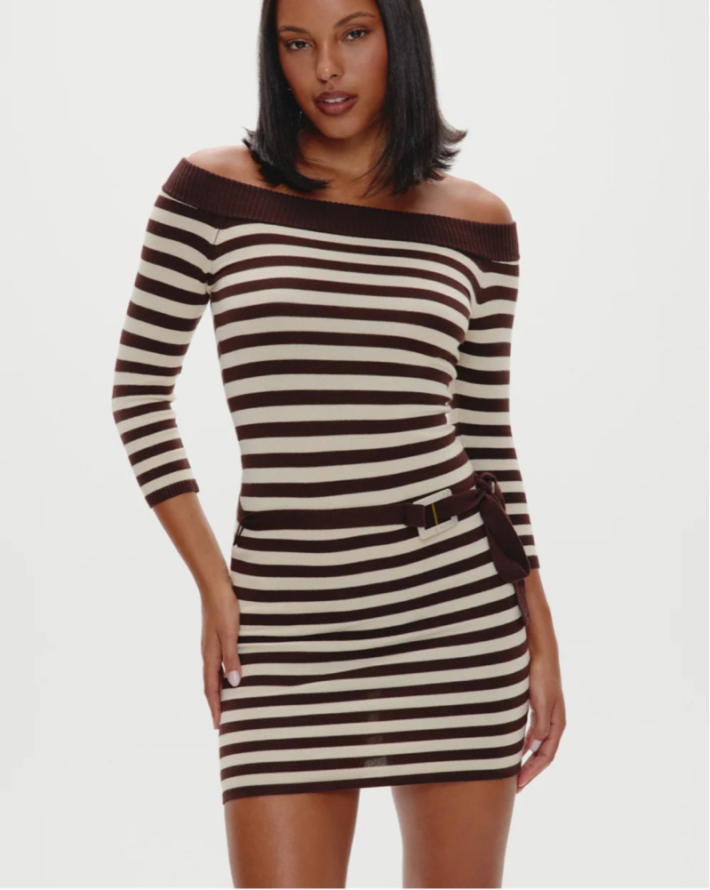 Saloon is a fitted mini dress that hugs the body in all the right places, featuring a fixed off-the-shoulder neckline. Whether styled up or down, it's a cozy piece made for every moment.