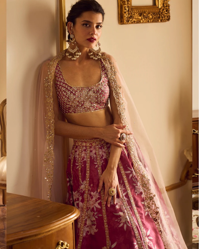 Maroon Floral Printed Indian Lehenga by Lashkaraa - Pickle