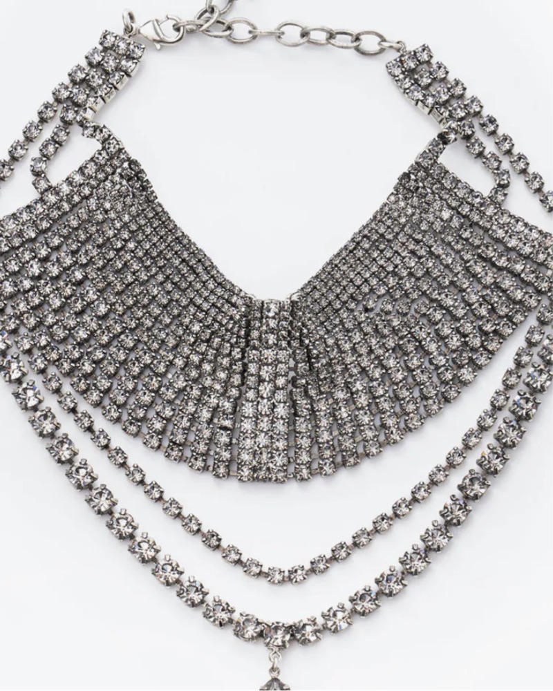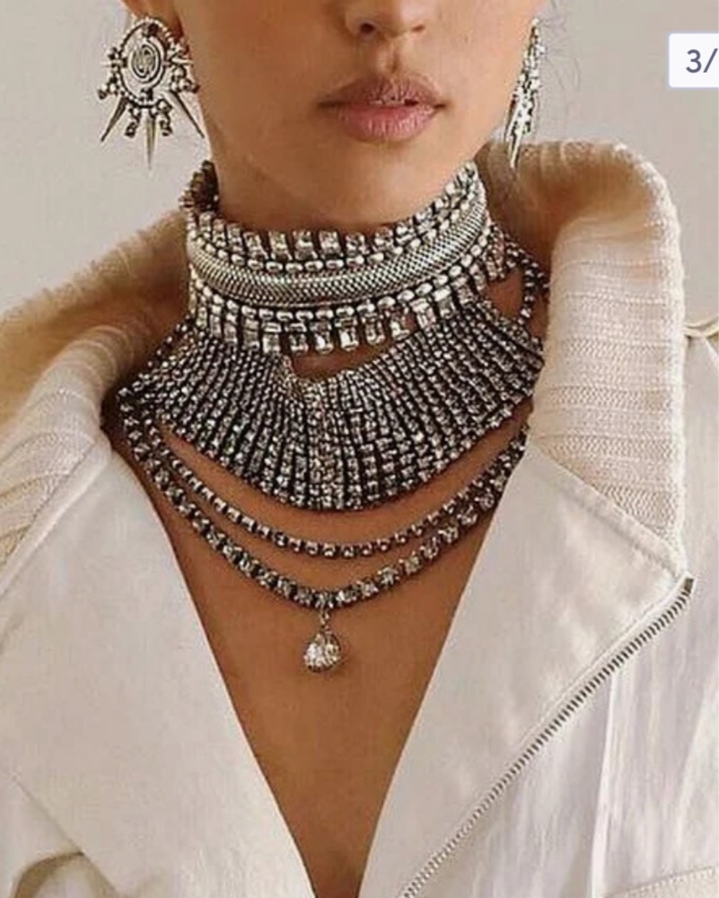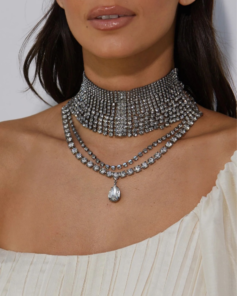 This necklace is unreal! Elevate your look with this stunning rhinestone-encrusted dress. Perfect for a glamorous event or night out on the town. #jewelry #accessories