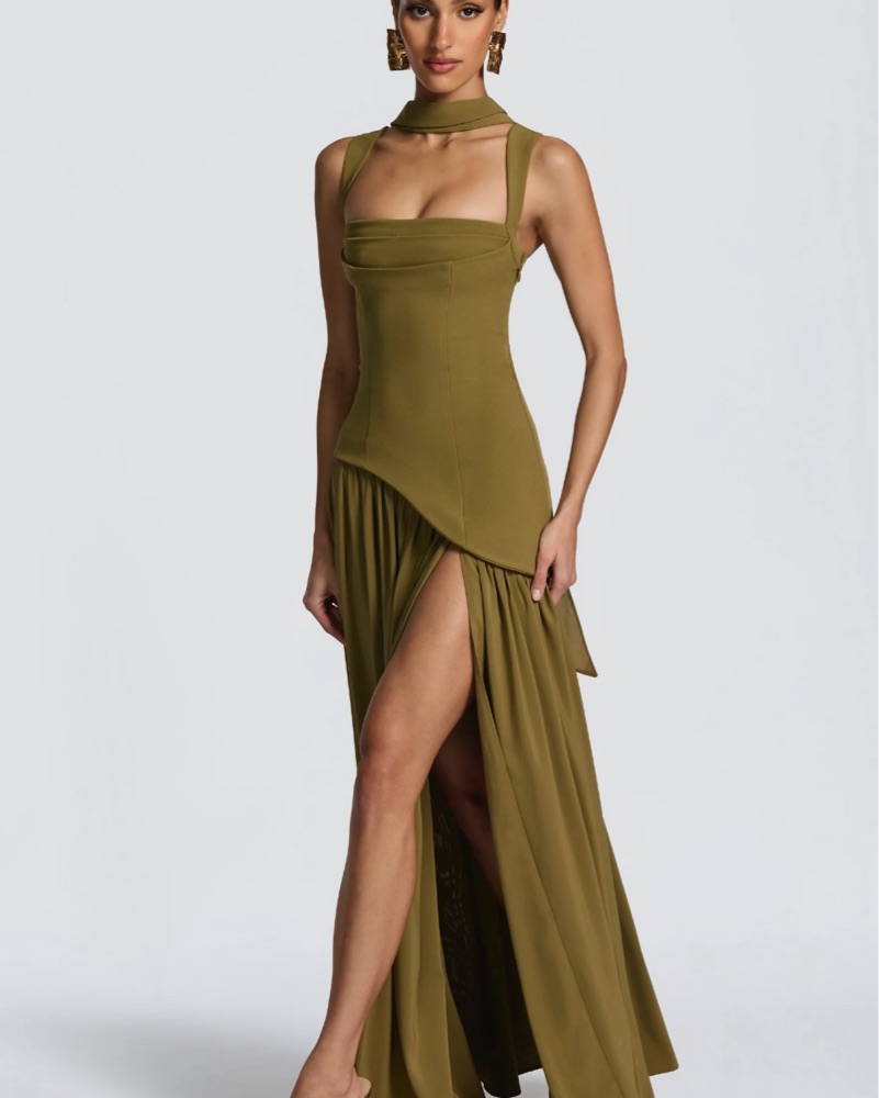 Tullulah Maxi Dress in Deep Olive, size Medium from Babyboo. Fits size 4/6. Sophisticated, sexy, built-in corset gown; includes chic neck scarf.