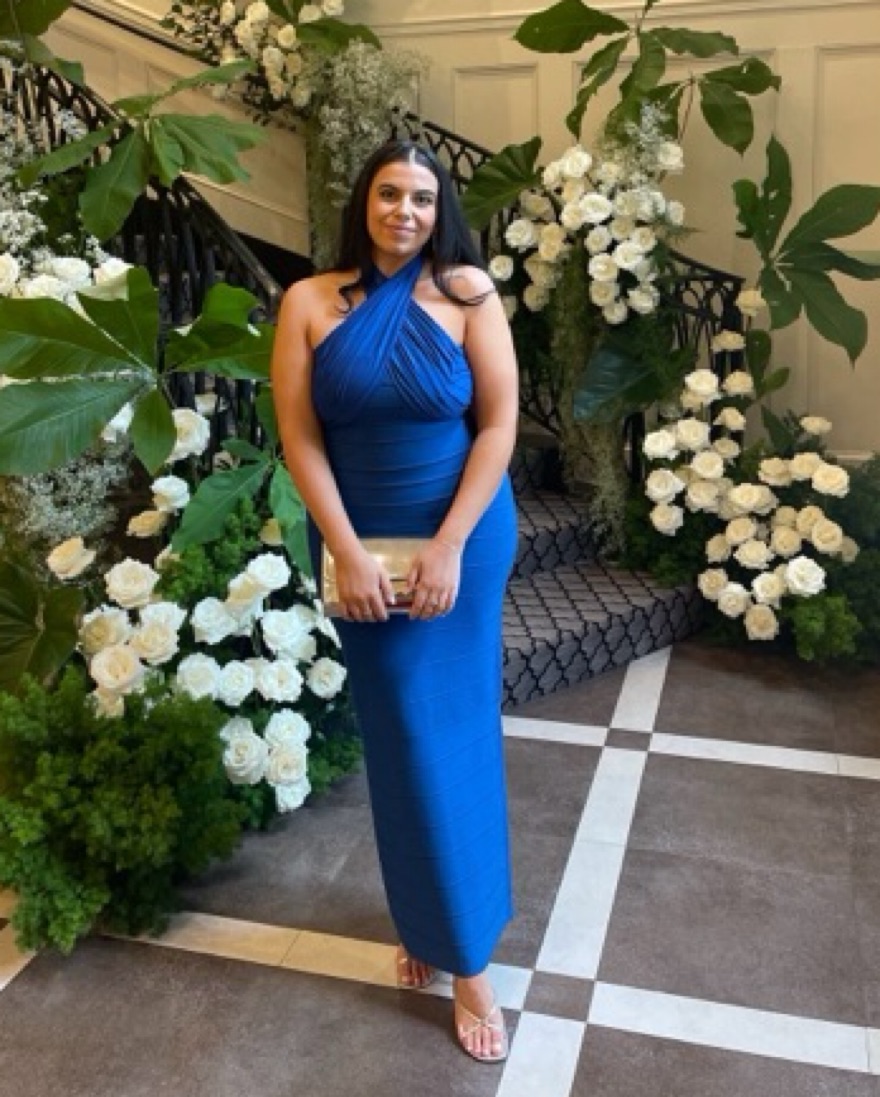 Size L but could fit XL. Cobalt blue satin and bandage wedding guest dress/gown. Bow has been removed. Super comfortable and flattering!