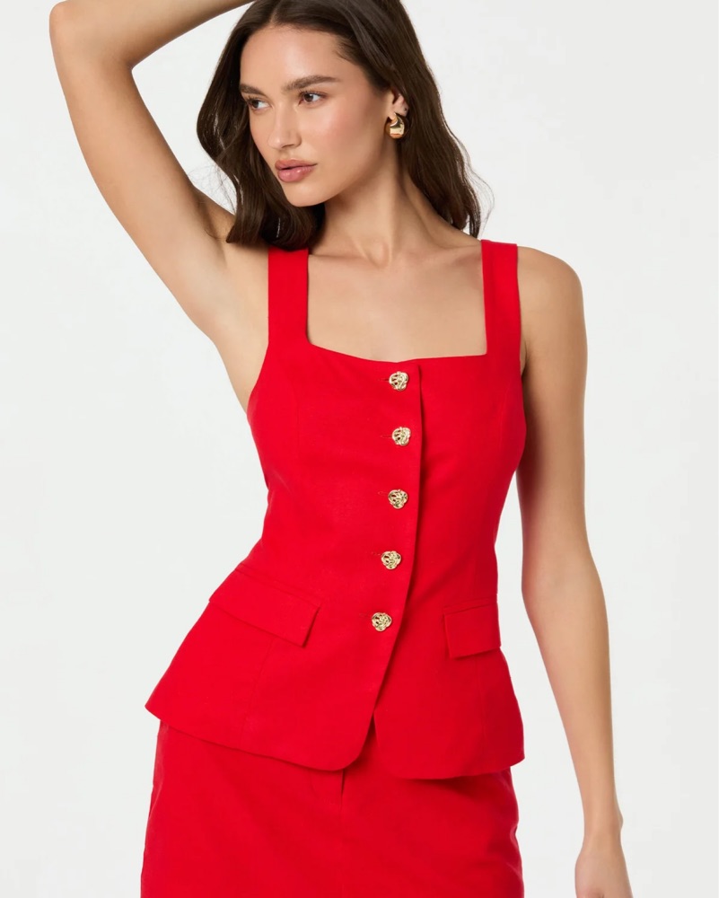 Stylish red sleeveless top with gold buttons. Perfect for any occasion. Brand new worn once size XS