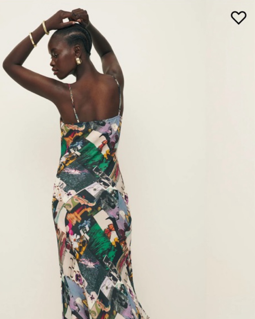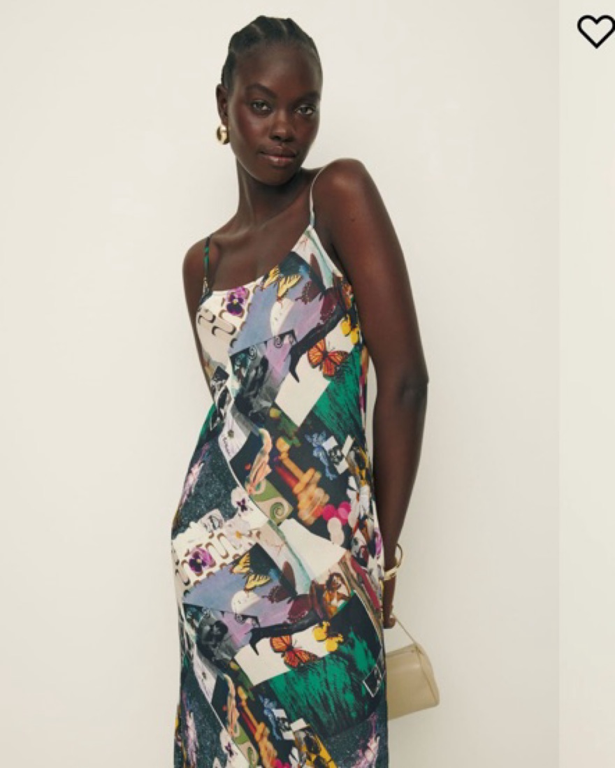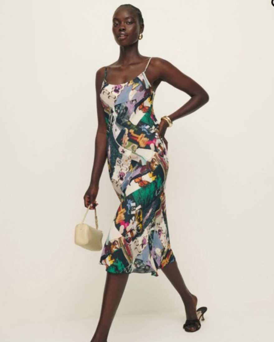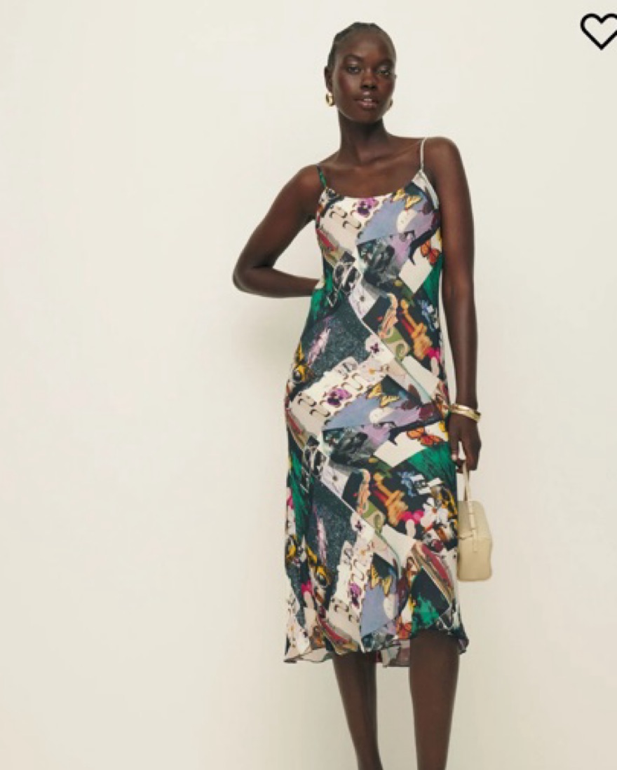 Reformation Midi Emerick Dress. New never worn. Official color on reformation website is Decoupage. Colorful dress with butterflies, flowers, etc. mix of purple, green, white