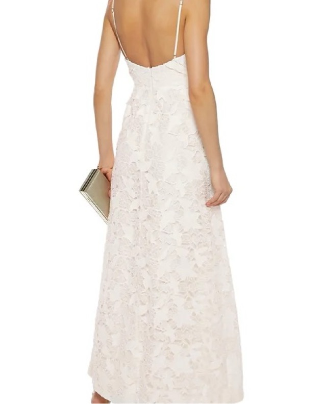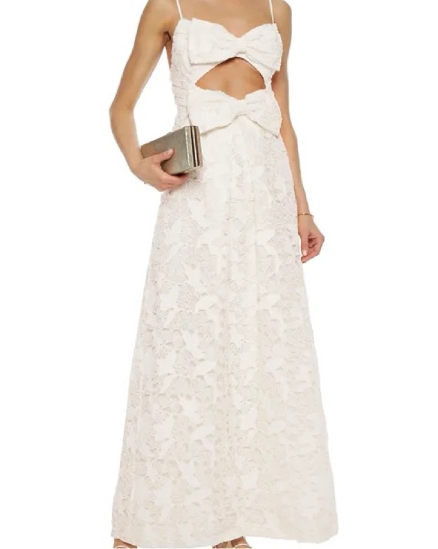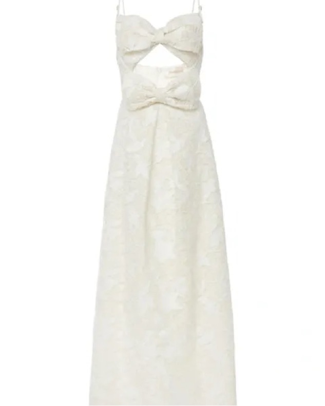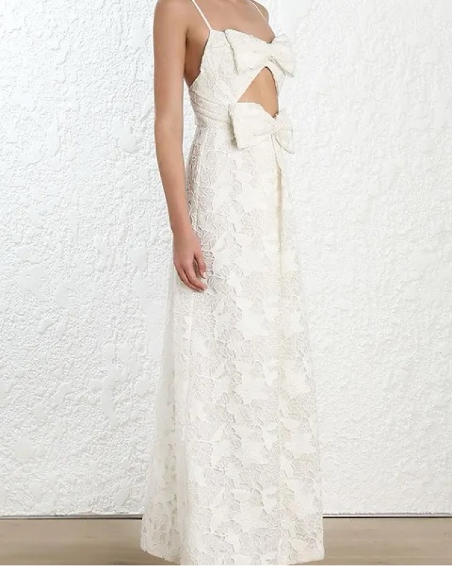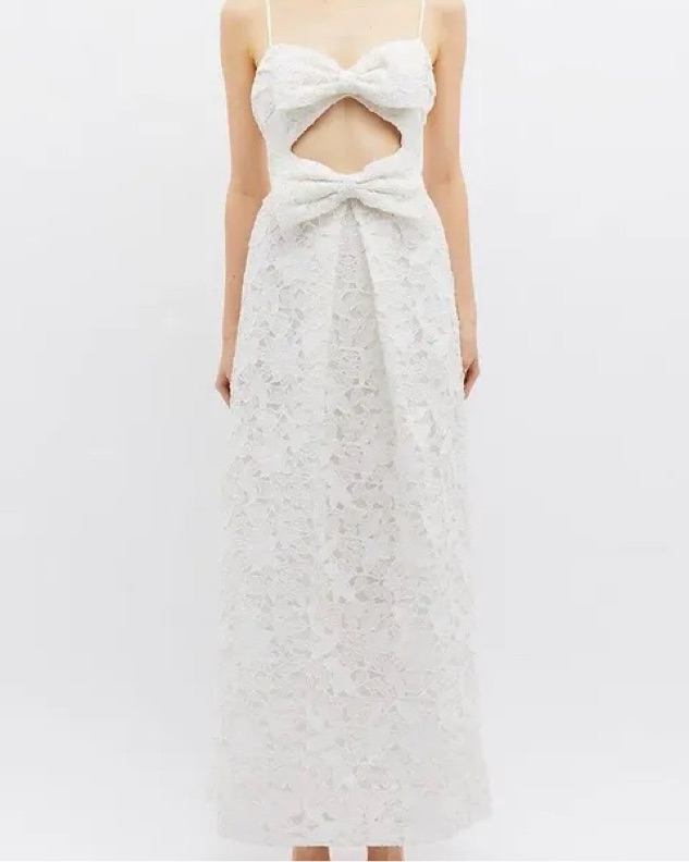 Featuring floor-length luxurious white lace in a delicate A line, falling from a cut out bow detailing at the bust.