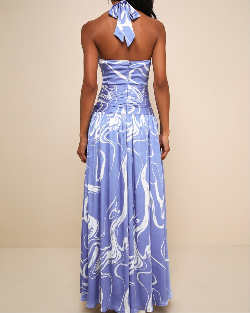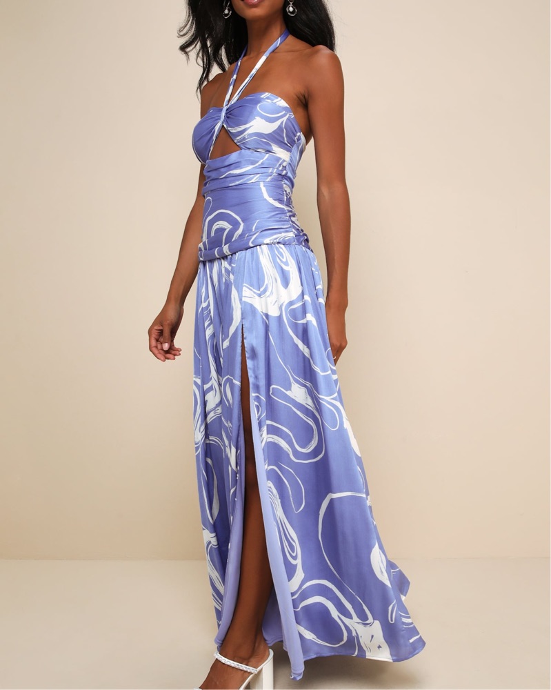 This gorgeous abstract-printed maxi dress is perfect for special occasions. The halter neckline and high slit add a touch of sultry elegance.