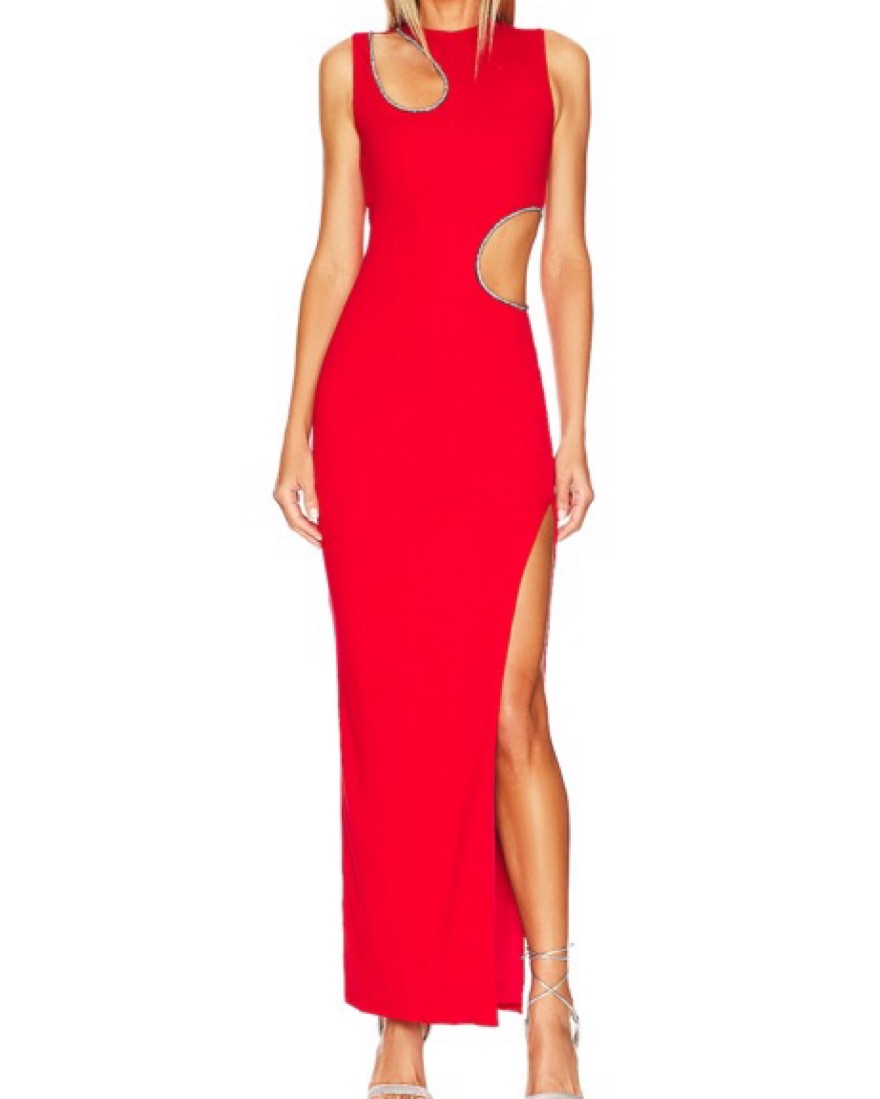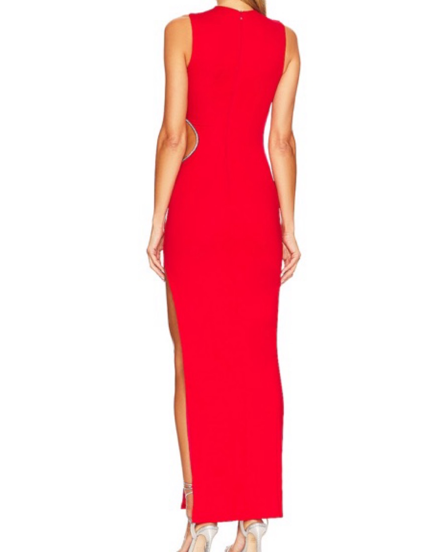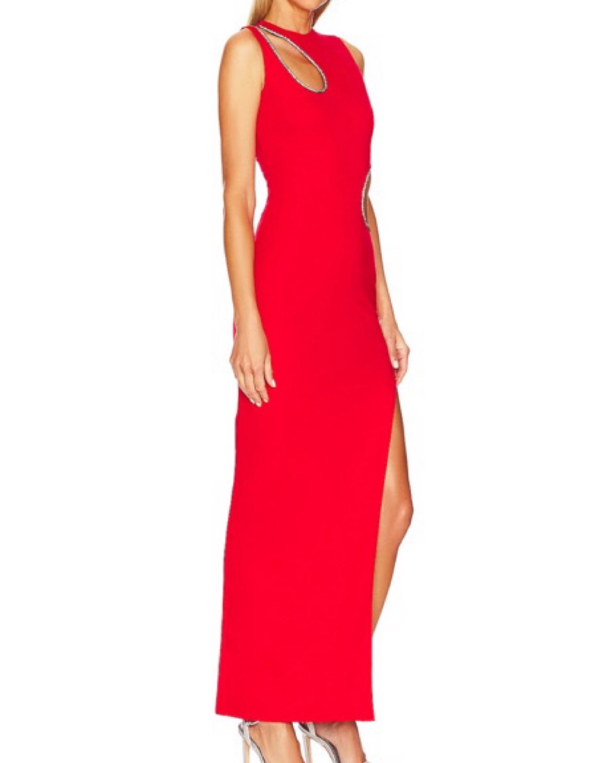 Sizzle in this sultry red maxi dress. The dramatic high slit and alluring cutouts make this gown perfect for a night out on the town.