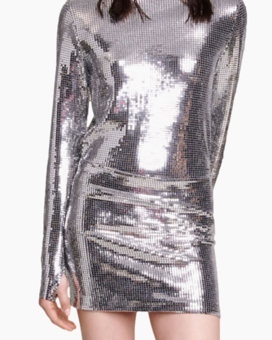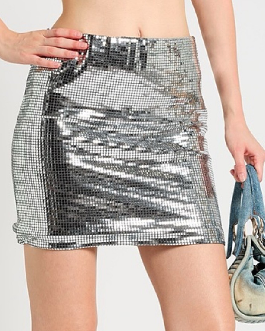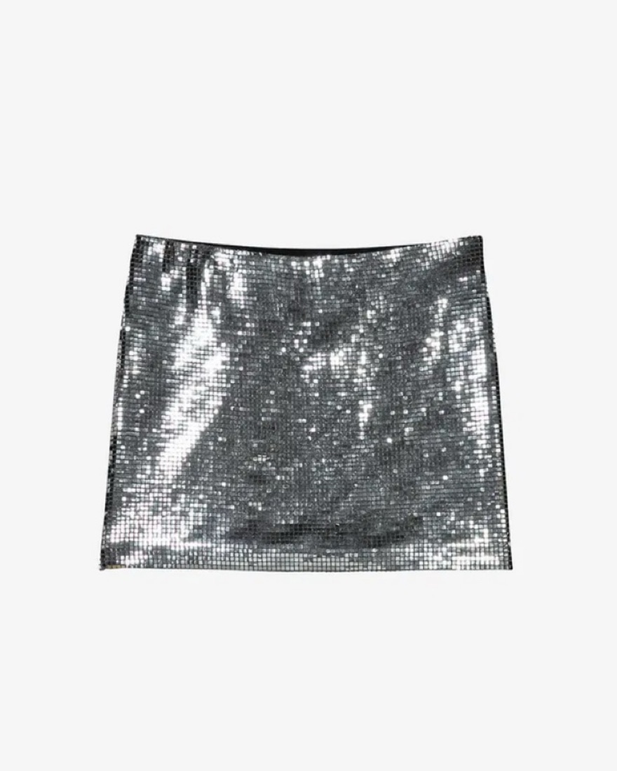 Maje mini skirt with elastic waistband and silver disco sequins. Super comfy and great for a night out. Fits a small or medium