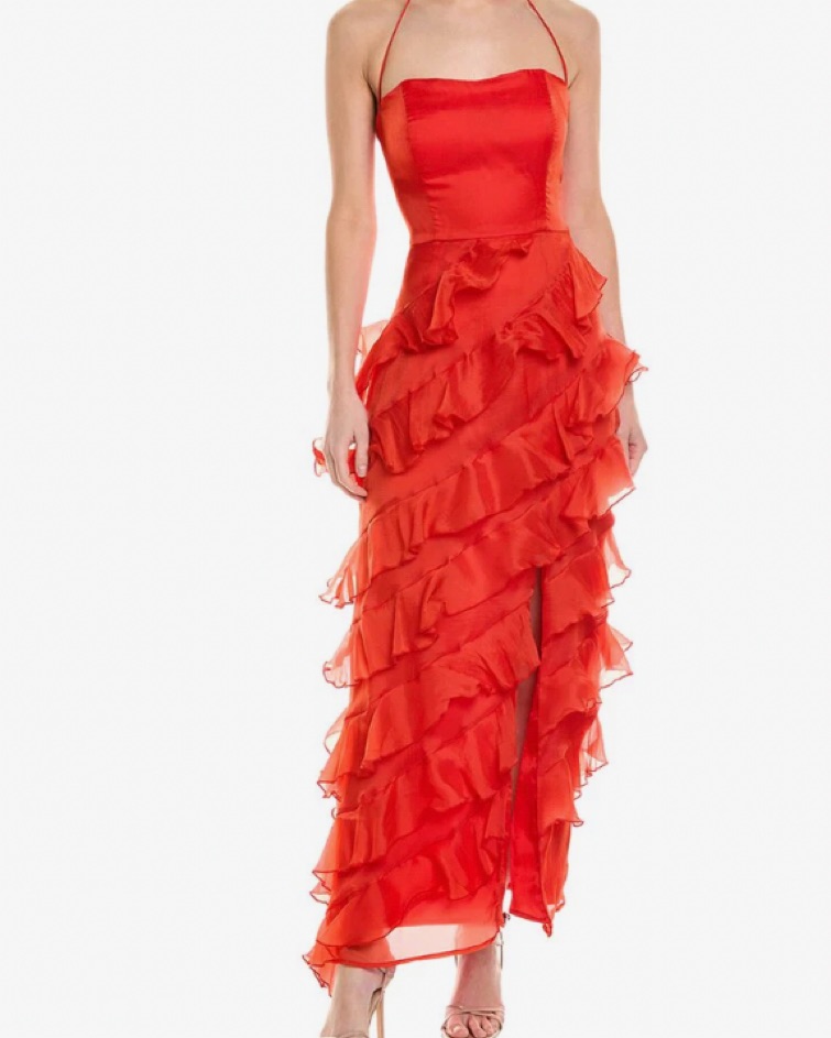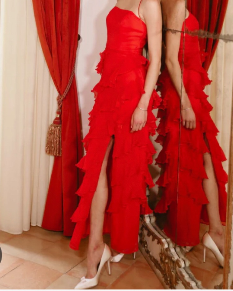 This striking red gown features dramatic ruffles cascading down the skirt, creating a stunning, eye-catching look. Perfect for a formal event or special occasion.
