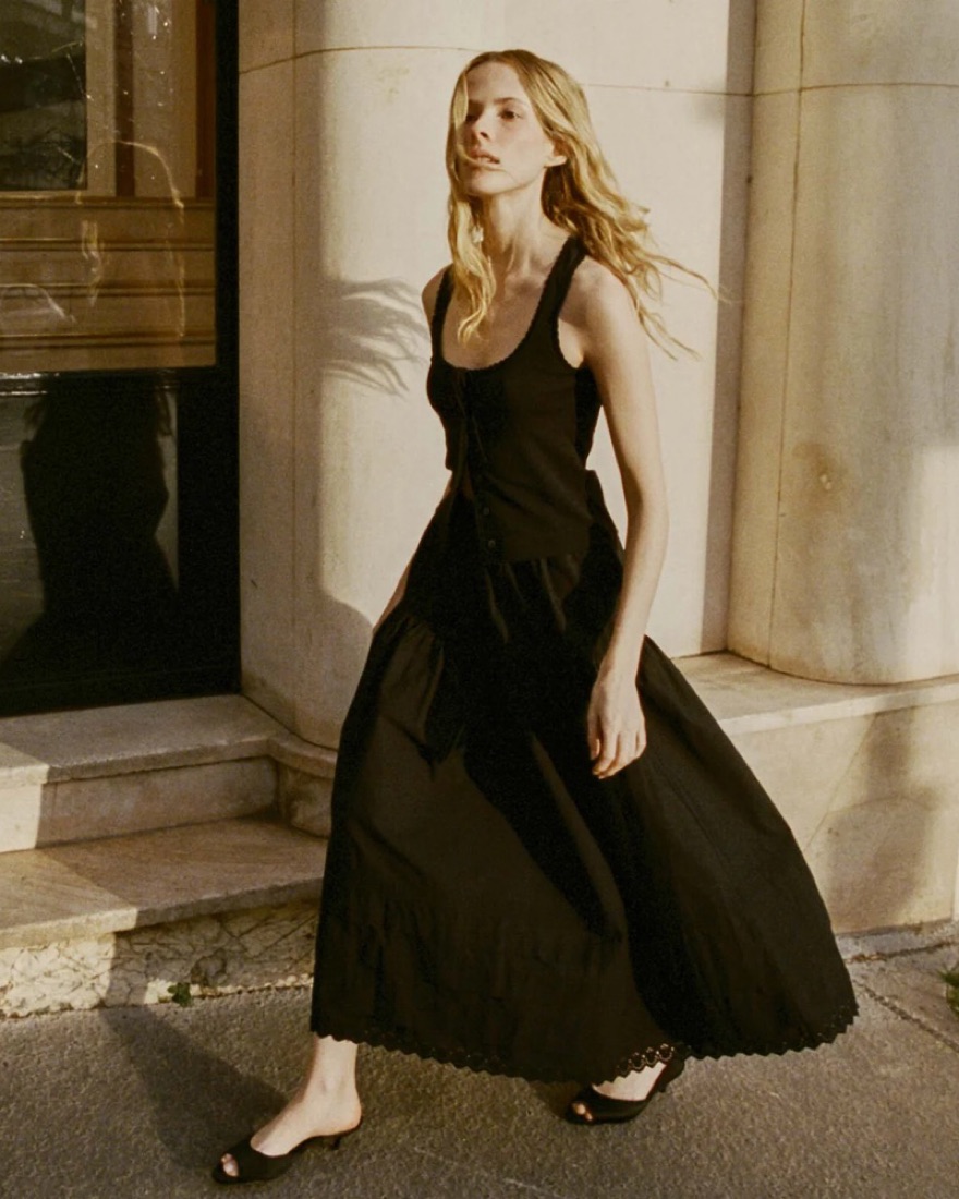 Inspired by an Edwardian-era trousseau and rendered in crisp organic cotton poplin, our best-selling Sebastiane Skirt—a forever favorite of our styling team—features a high waist, an A-line silhouette graced with horizontal tiered pintucks, and an ankle-grazing hemline trimmed with scallop eyelet em