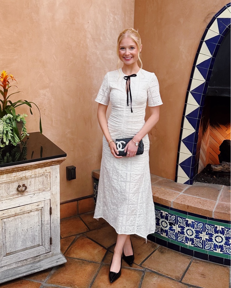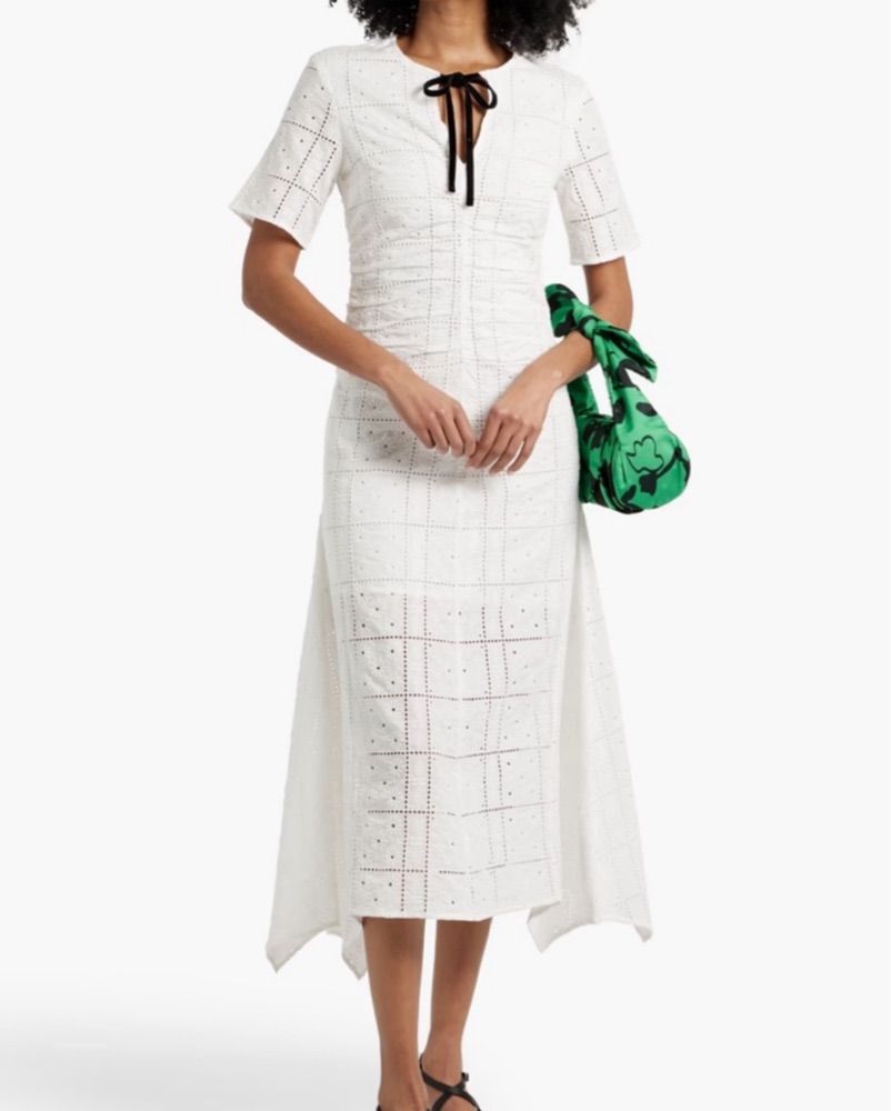 It's cut from organic broderie anglaise cotton and accented with a pretty black bow. It's fitted at the waist and has a paneled skirt with a handkerchief hem.