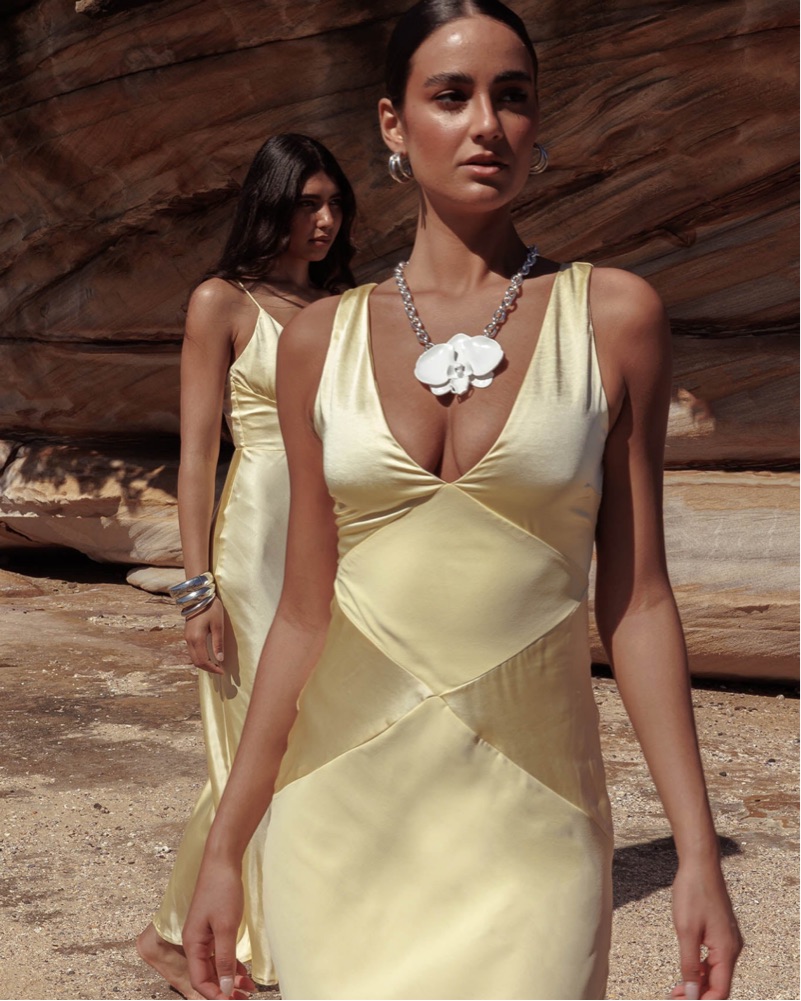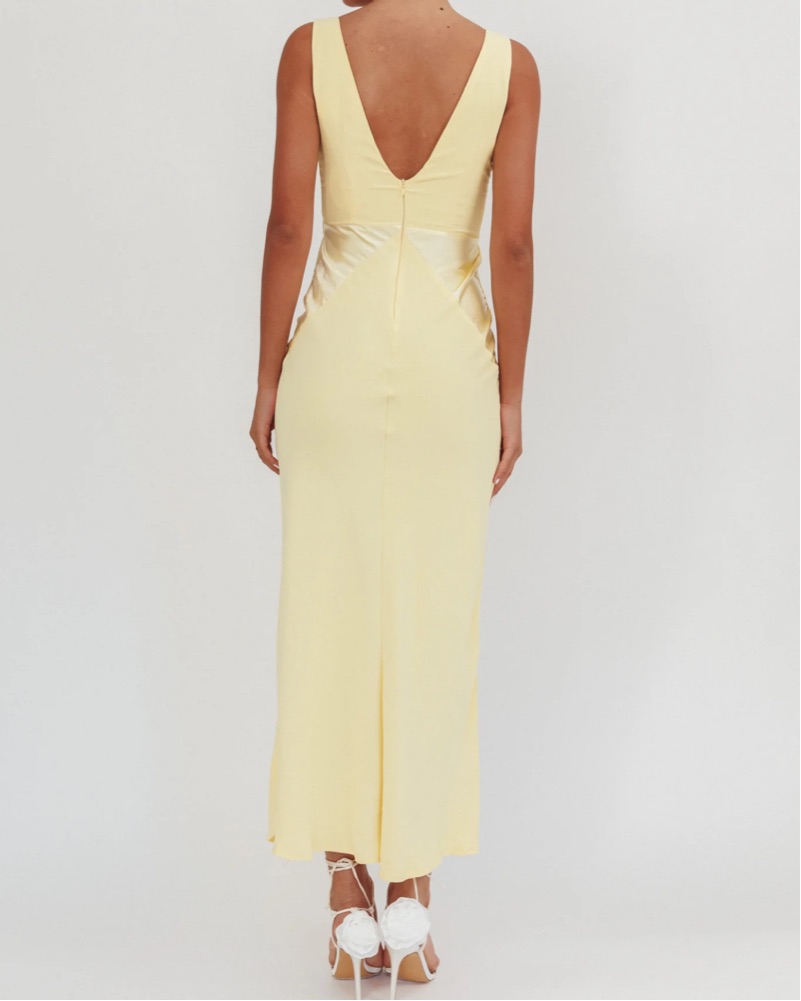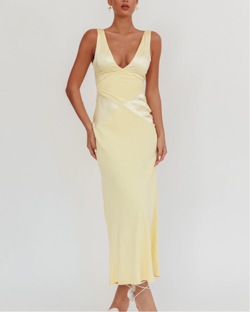 Gorgeous butter yellow satin dress perfect for a formal occasion/wedding guest. Figure-flattering silhouette and deep v-neckline create a glamorous look. Brand new with tags!