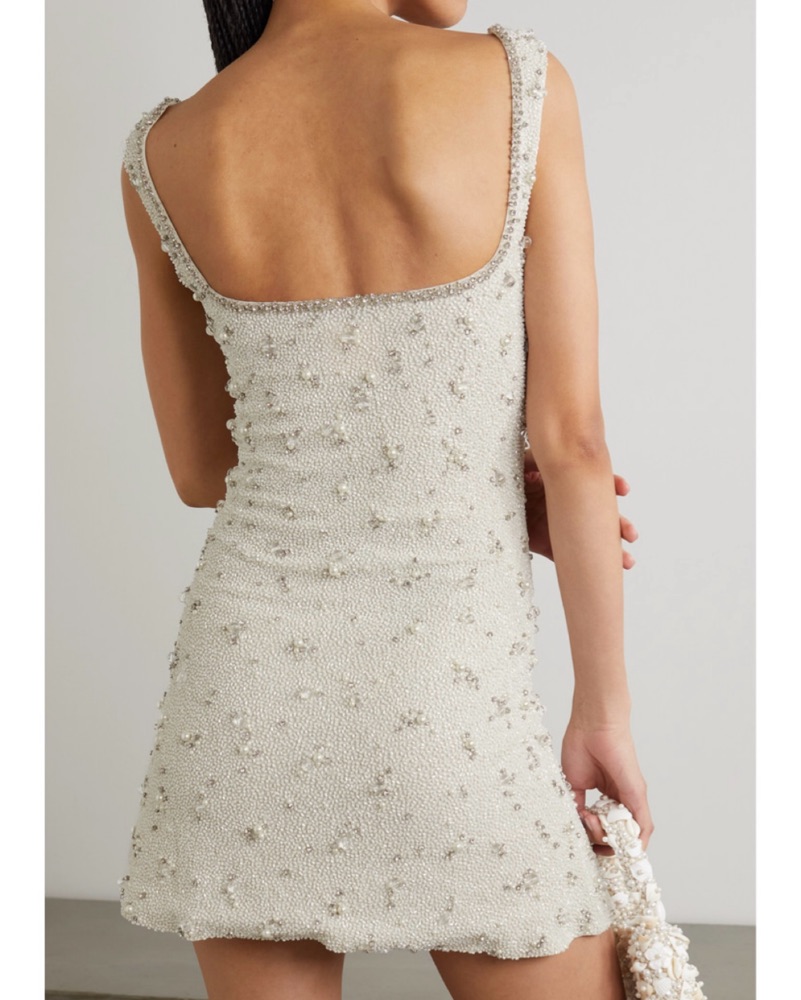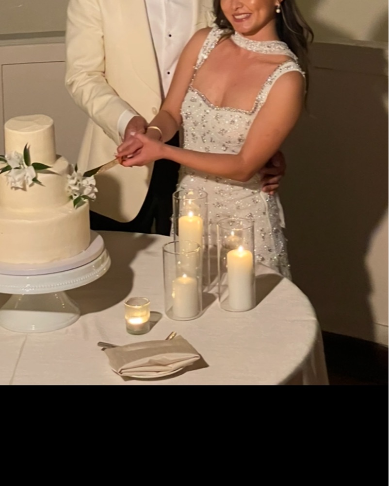 Gorgeous bridal crystal dress in XS. Perfect for after party! I’m usually a 0 in dresses and it fit comfortably. The dress does have a lot of stretch so it can probably fit up to a size 2.