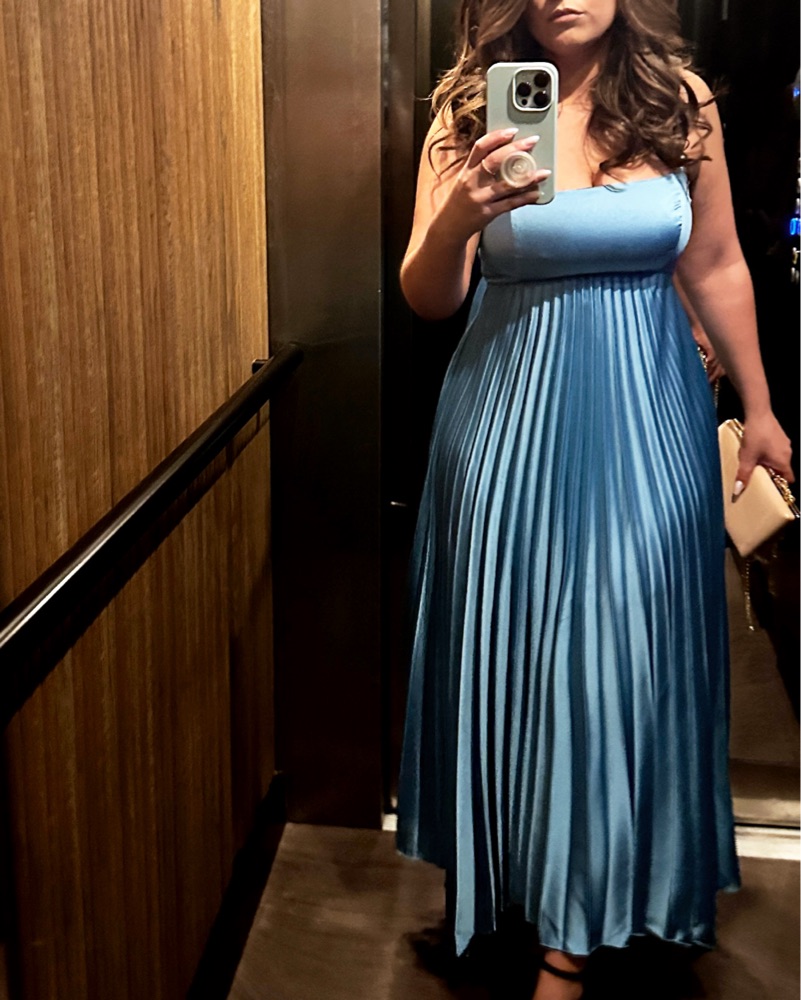 Worn once! Wedding Guest Line - Giselle Pleated Midi Dress - Small Petite * Pleated Skirt with asymmetrical hem. Lined. * Color: Light Blue * Fabric: 100% Polyester * Back-design: Clasp-back closure. Concealed zipper