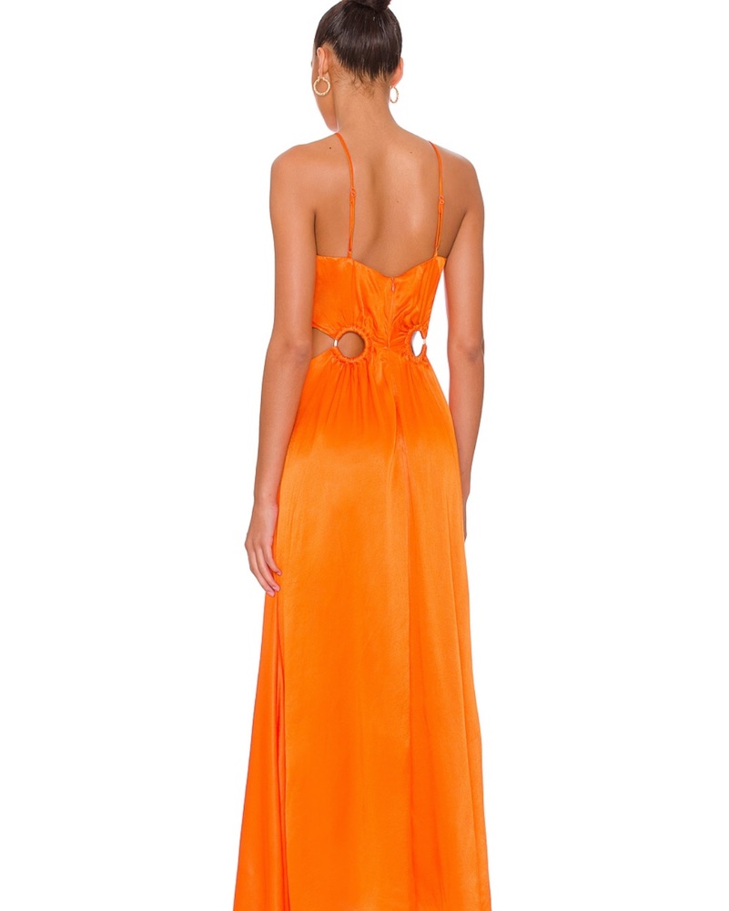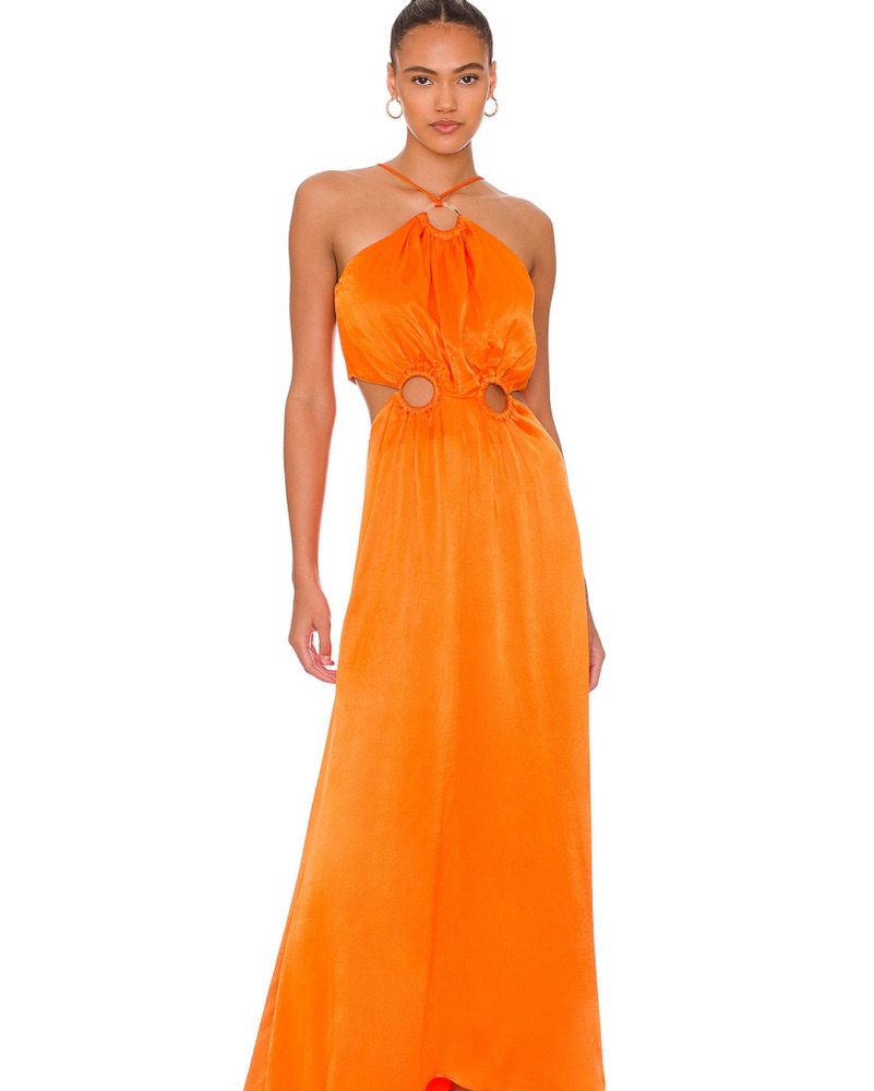 This stunning maxi dress is sure to turn heads with its bold, vibrant orange hue. The halter neckline and flowing, lightweight fabric create a chic, elegant look perfect for any summer event.