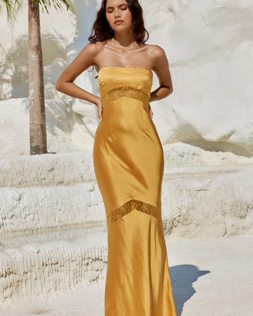 Hemmed for shorter girls! Silk gown with lace cut outs. Strapless dress. Bright colors. Maxi dress. Long dress. Perfect dress for a wedding, formal, vacation dress, charity event or prom!